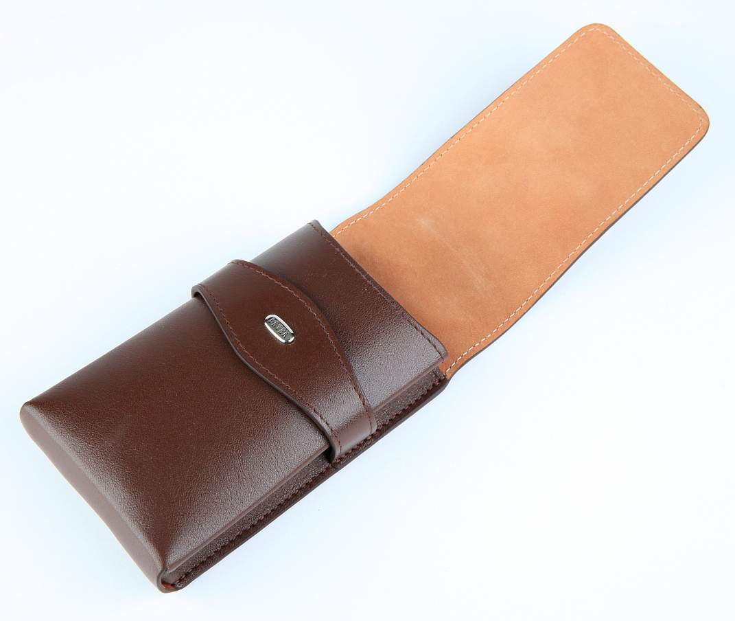 Футляр для сигарет Petek из натуральной кожи. Крепление на ремень, закрывается хлястиком, отделение для пачки сигарет, комплект из 5 мундштуков.