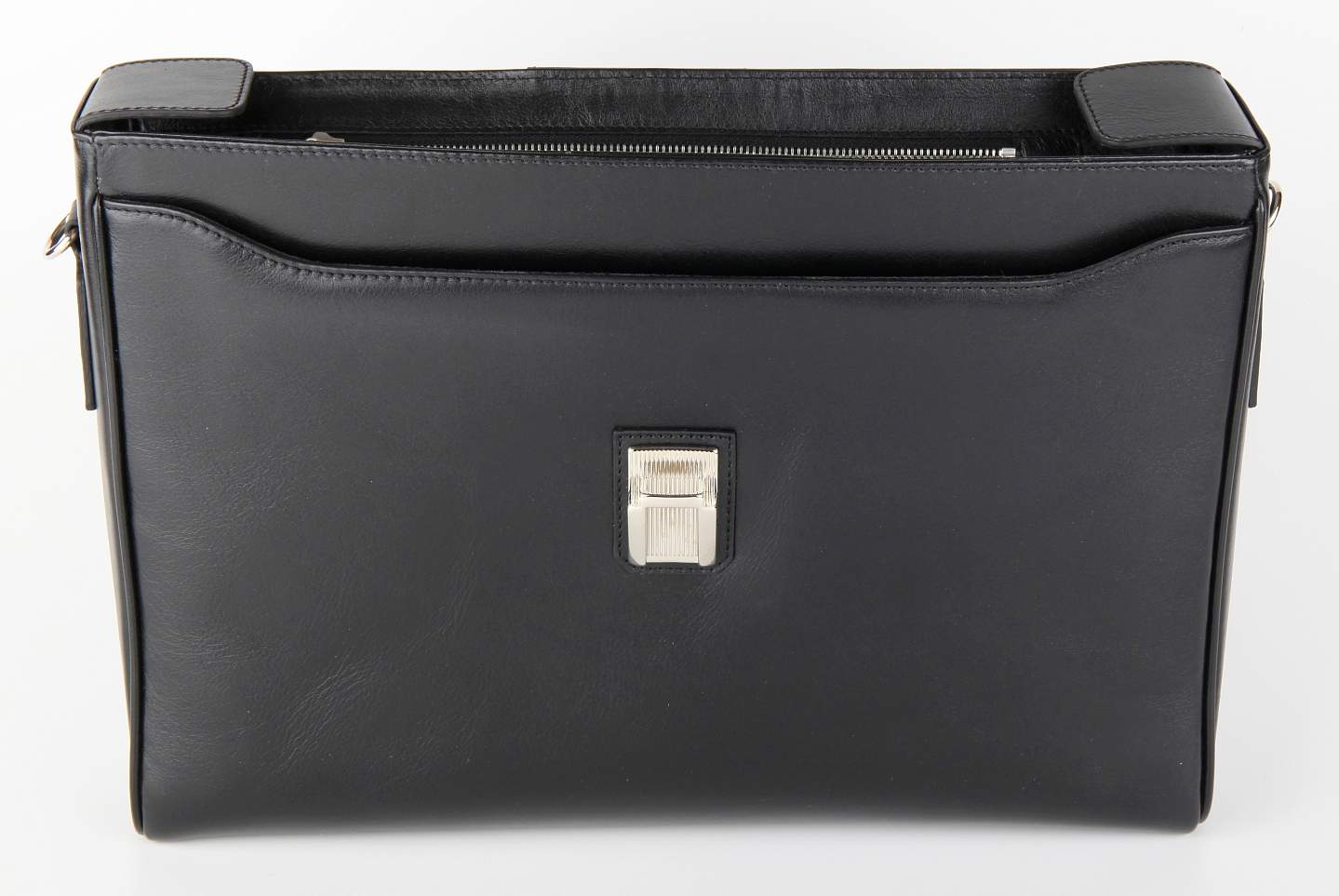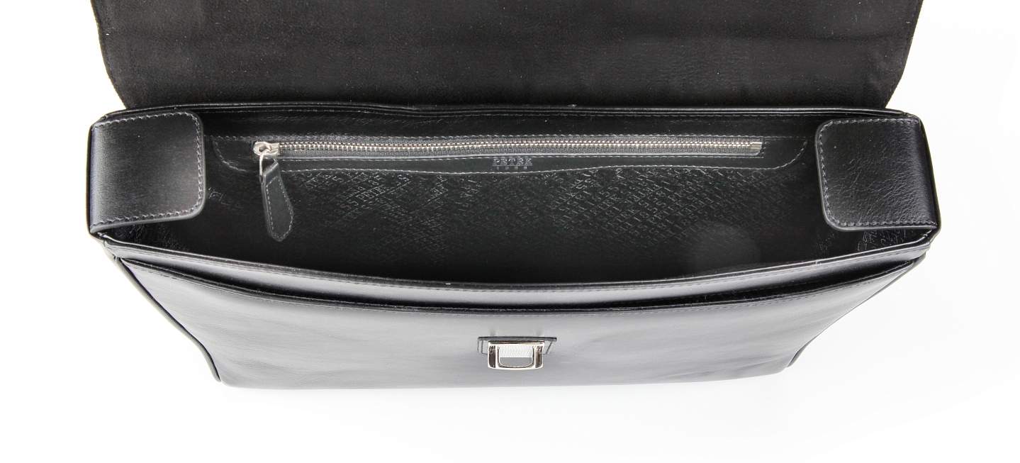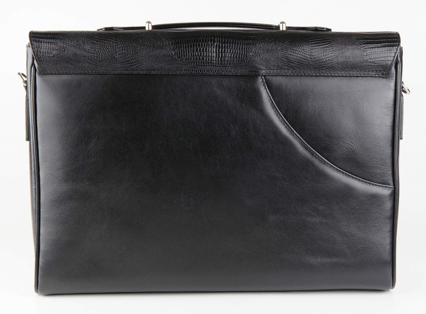 Стильный мужской портфель выполнен из натуральной кожи. Портфель закрывается при помощи клапана на металлический замок. Внутри имеет одно вместительное отделение, содержащее карман на застежке-молнии. Под клапаном расположен карман для бумаг. На задней стенке портфеля расположен дополнительный карман для бумаг. Портфель оснащен удобной ручкой, в комплекте текстильный чехол для хранения и съемный плечевой ремень. Этот стильный аксессуар станет изысканным дополнением к вашему образу. Портфель упакован в коробку с фирменным логотипом.