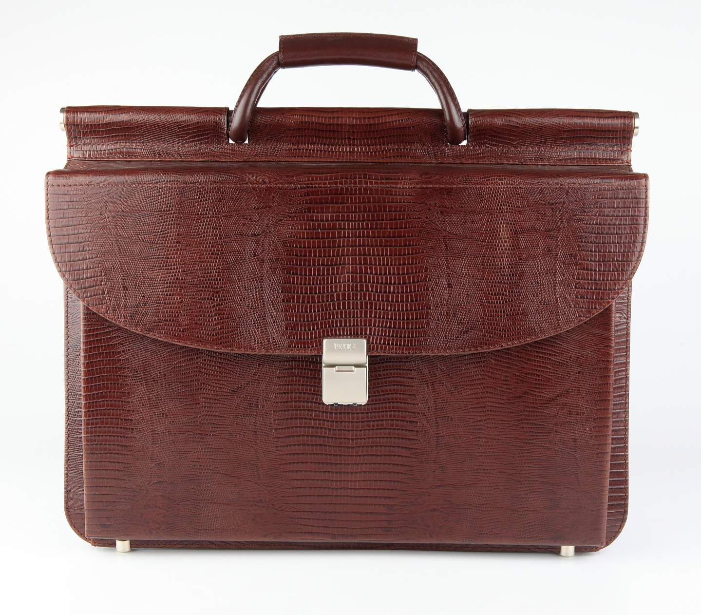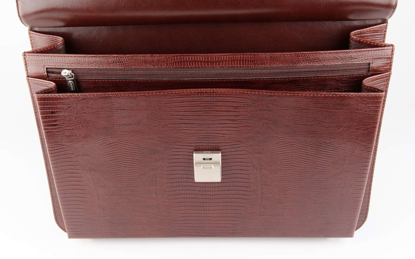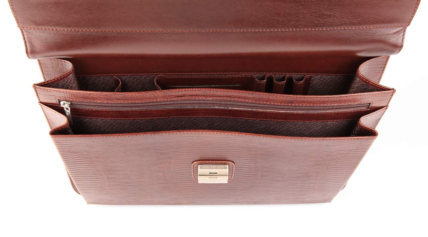 Интересная и практичная модель из натуральной кожи. Объемный и вместительный портфель, оригинальный дизайн, внутри два просторных отделения для всего, что может понадобиться. Ручки крепятся на прочный металлический стержень, имеются металлические ножки, кодовый замок для сохранности важных документов.