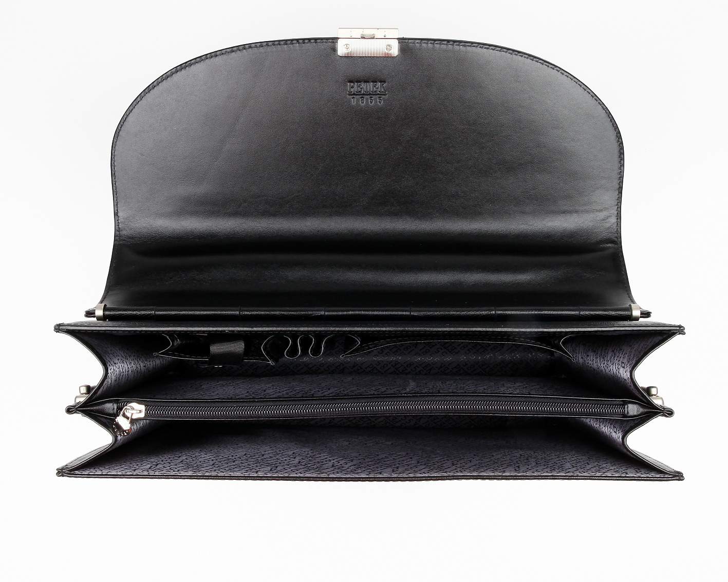 Портфель из фактурной кожи. В комплекте прилагается наплечный ремень для ещё более удобного ношения. Ручка. Плечевой ремень. Металлические ножки. Закрывается на портфельный замок с кодом. 2 внутренних отделения. 3 кармана на молниях для документов, сотового телефона, канцелярских принадлежностей.