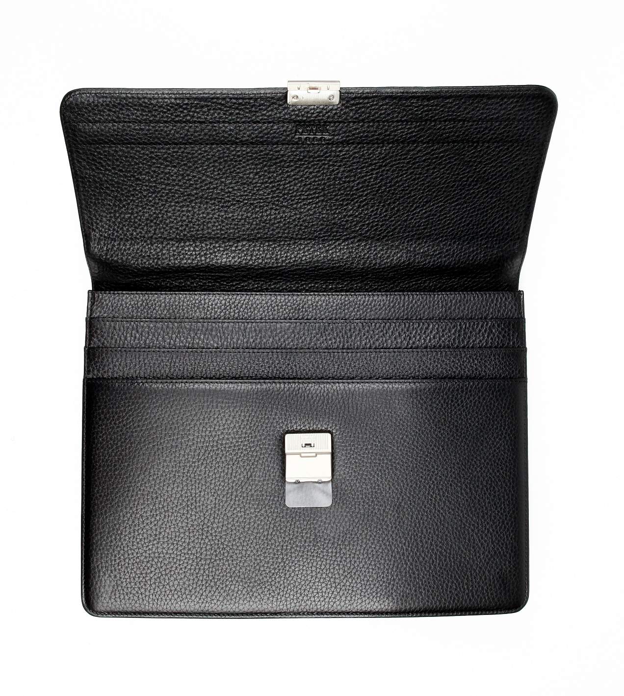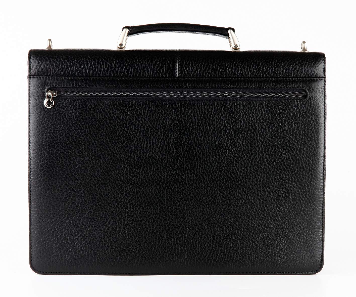 Портфель из натуральной кожи великолепной выделки. Элегантная и компактная модель для солидных деловых людей, предпочитающих классический стиль и строгие формы, подчеркнет статус своего владельца. Внутри имеется основной отдел для бумаг, отделение на молнии на задней стенке, а также держатель для ручек, специальный карман для мобильного телефона и объемный карман для записной книжки или кошелька. Перед основным отделением имеются три дополнительных отдела для документов и бумаг. На оборотной стороне портфеля – карман на молнии. Сохранность важных документов гарантирует надежный кодовый замок, изготовленный в Швейцарии из легированной стали специально для PETEK 1855 В комплекте кожаный плечевой ремень.