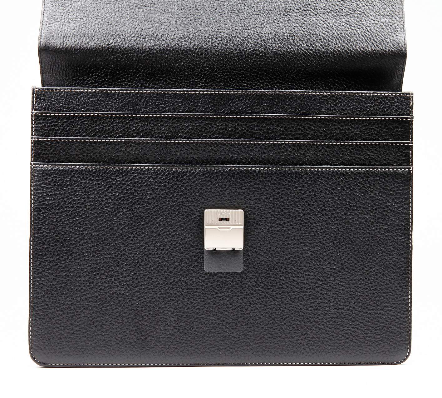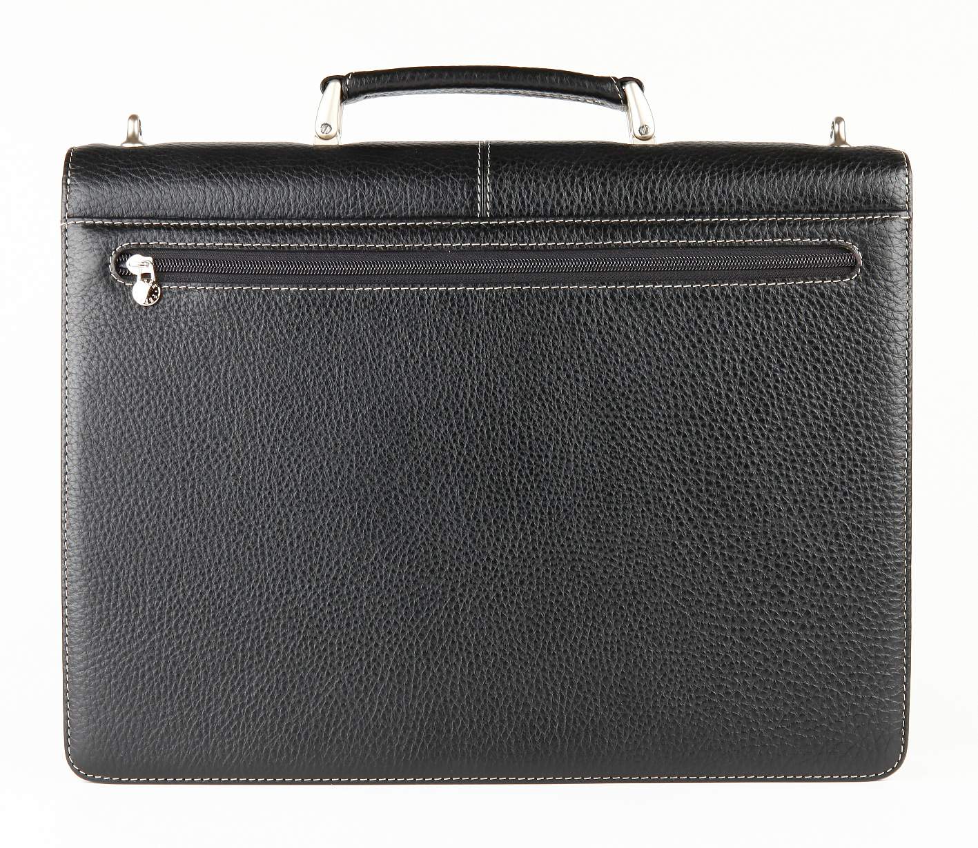 Портфель из натуральной кожи великолепной выделки. Элегантная и компактная модель для солидных деловых людей, предпочитающих классический стиль и строгие формы, подчеркнет статус своего владельца. Внутри имеется основной отдел для бумаг, отделение на молнии на задней стенке, а также держатель для ручек, специальный карман для мобильного телефона и объемный карман для записной книжки или кошелька. Перед основным отделением имеются три дополнительных отдела для документов и бумаг. На оборотной стороне портфеля – карман на молнии. Сохранность важных документов гарантирует надежный кодовый замок, изготовленный в Швейцарии из легированной стали специально для PETEK 1855 В комплекте кожаный плечевой ремень.