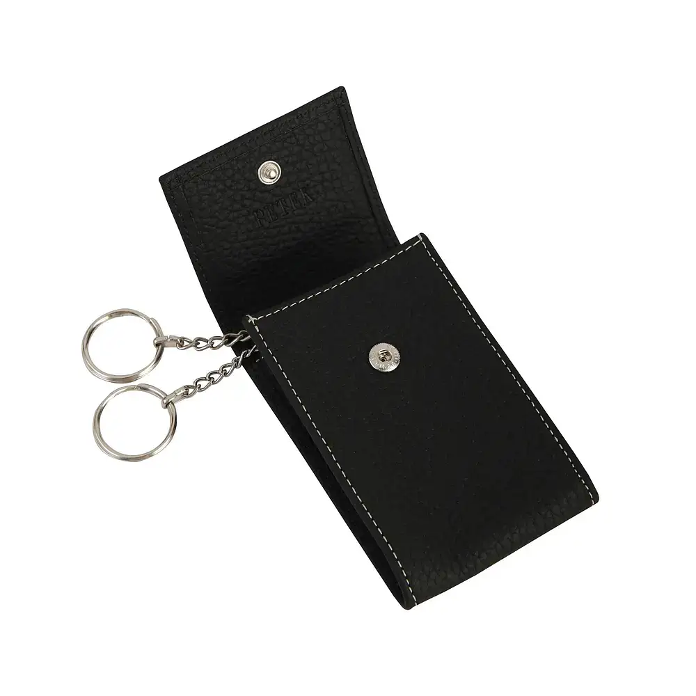 Защёлкивается на кнопку. В ней можно разместить ключи длиной до 9 сантиметров.