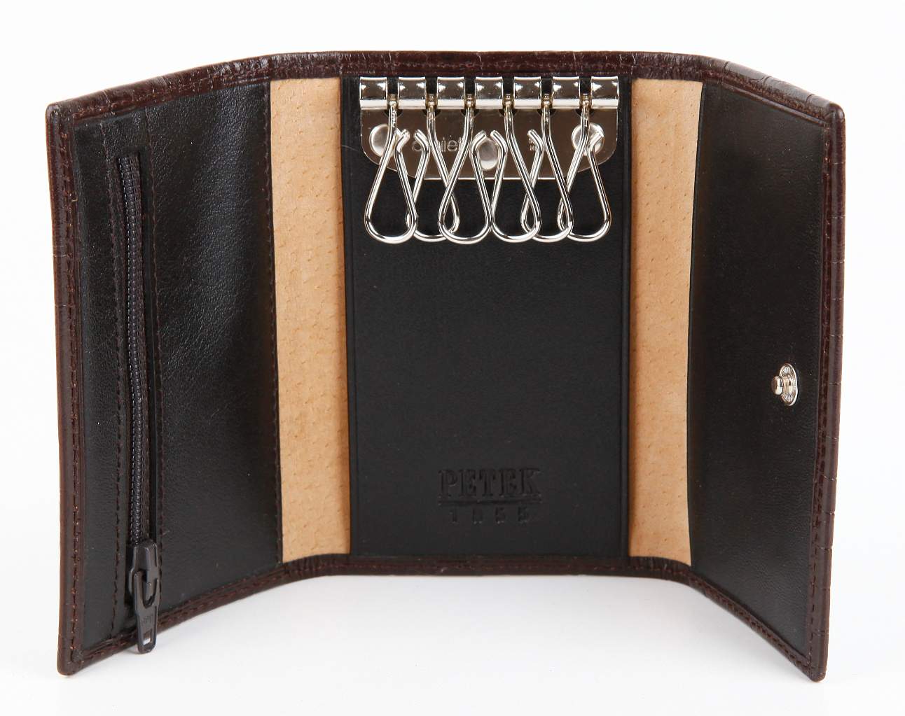 Кожаная ключница Petek.Внутри 6 карабинов для ключей и небольшой кармашек на молнии. Закрывается на кнопку.