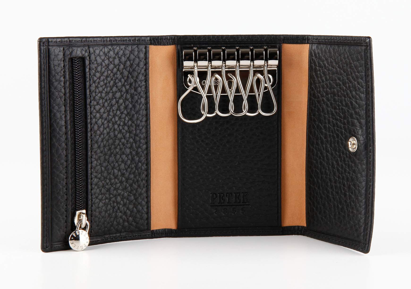 Кожаная ключница Petek.Внутри 6 карабинов для ключей и небольшой кармашек на молнии. Закрывается на кнопку.