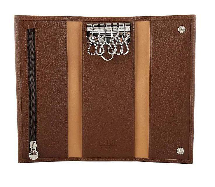 Стильный кожаный футляр на 6 ключей, внутри небольшое отделение на молнии. Закрывается на 2 кнопки.
