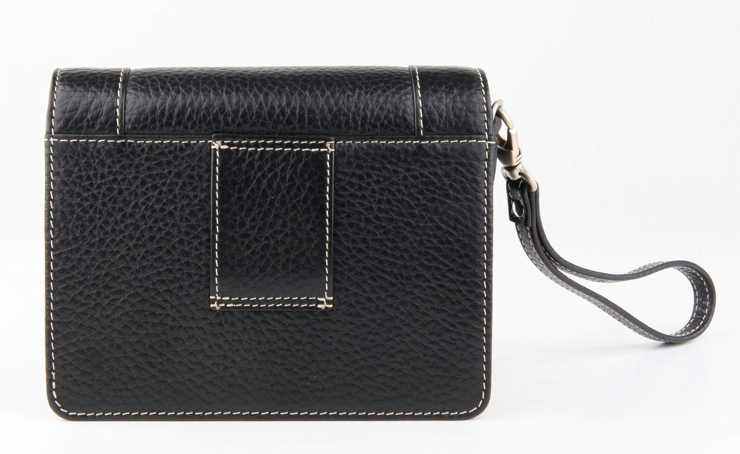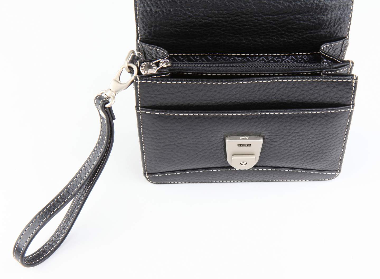 Мужская барсетка Petek из натуральной кожи черного цвета с зернистой фактурой. Хлястик для крепления на ремень. Съемный ремешок на запястье. Закрывается на портфельный замок с ключом. 2 внутренних отделения. 2 внутренних кармана (1 из них на молнии).