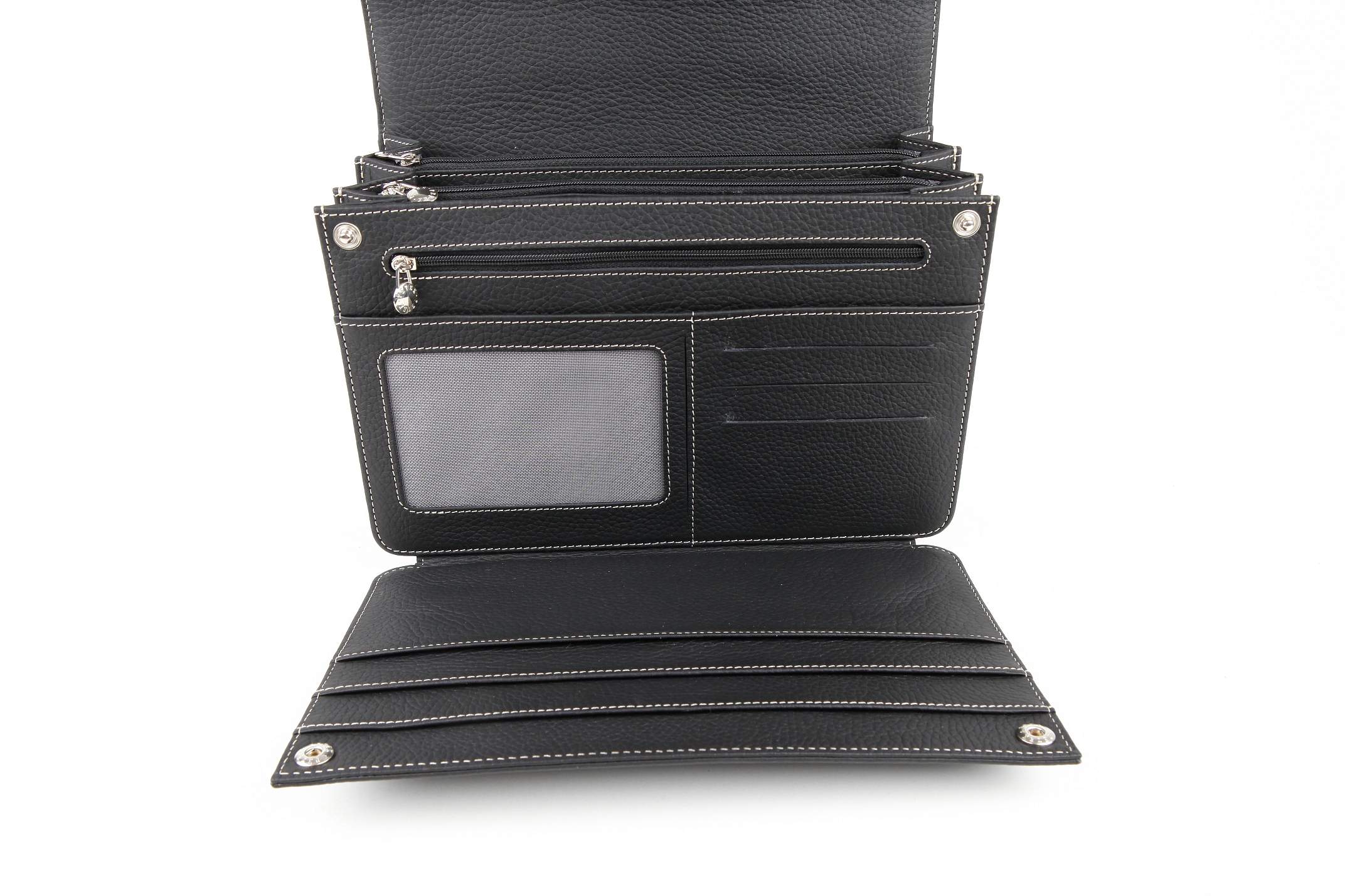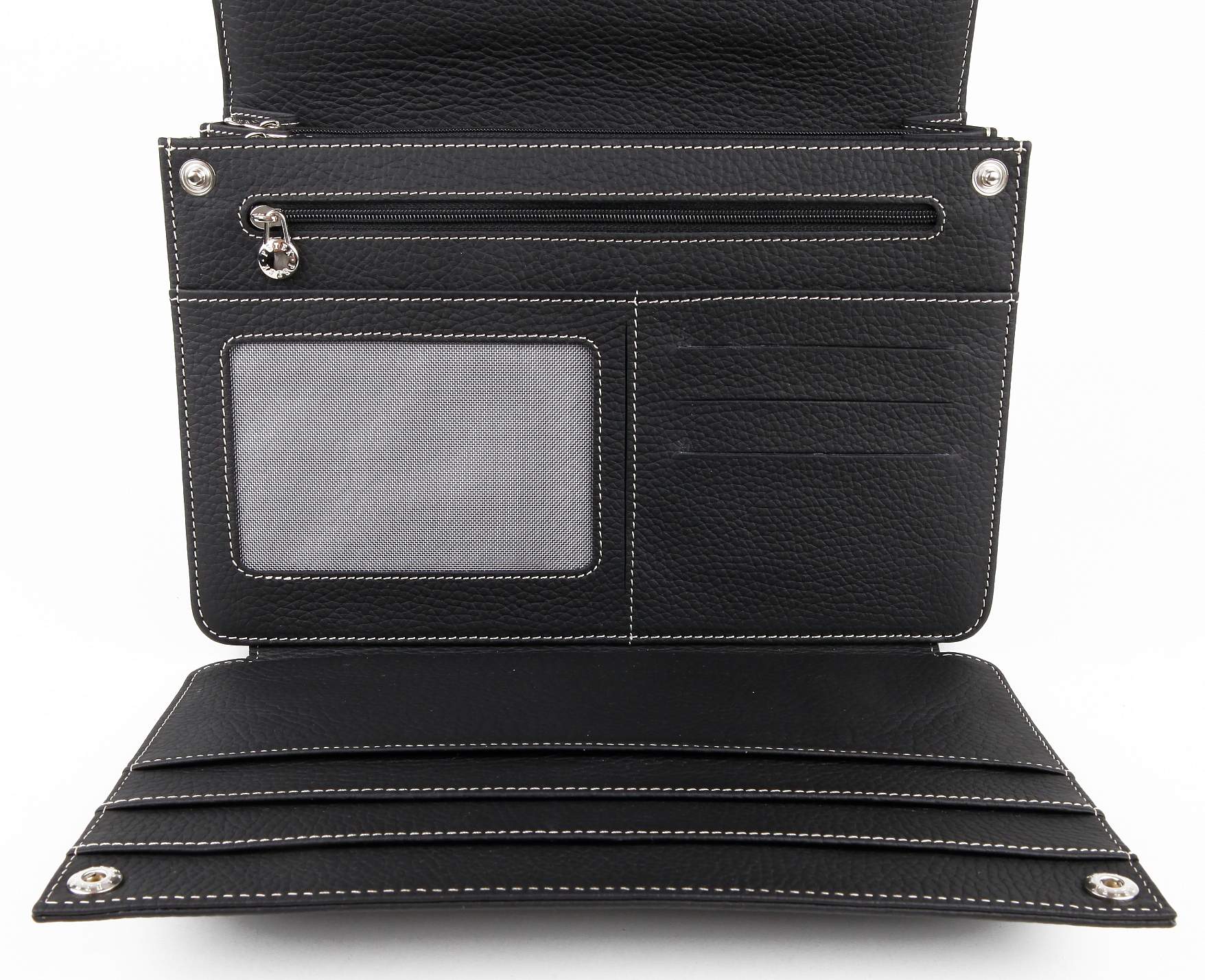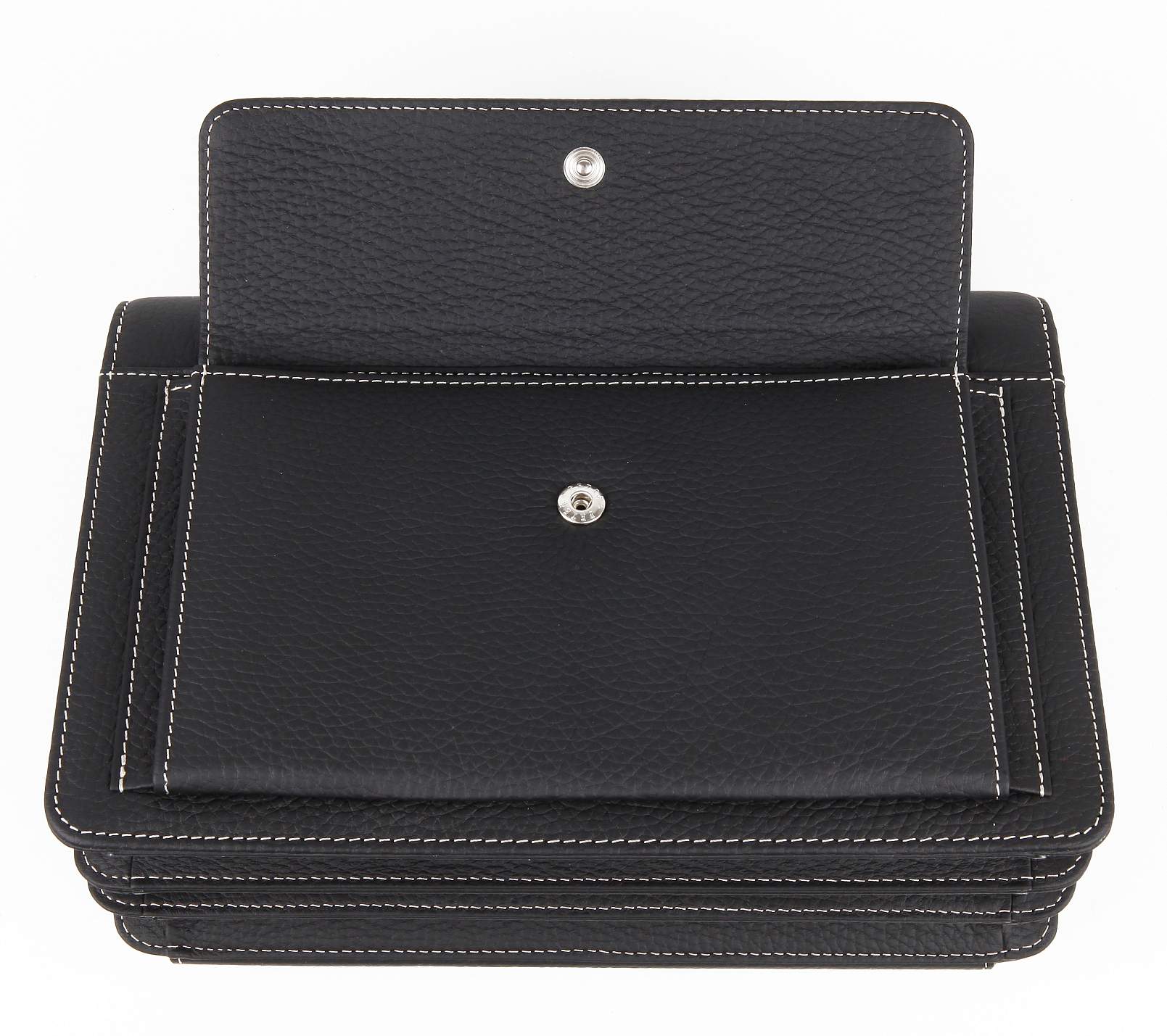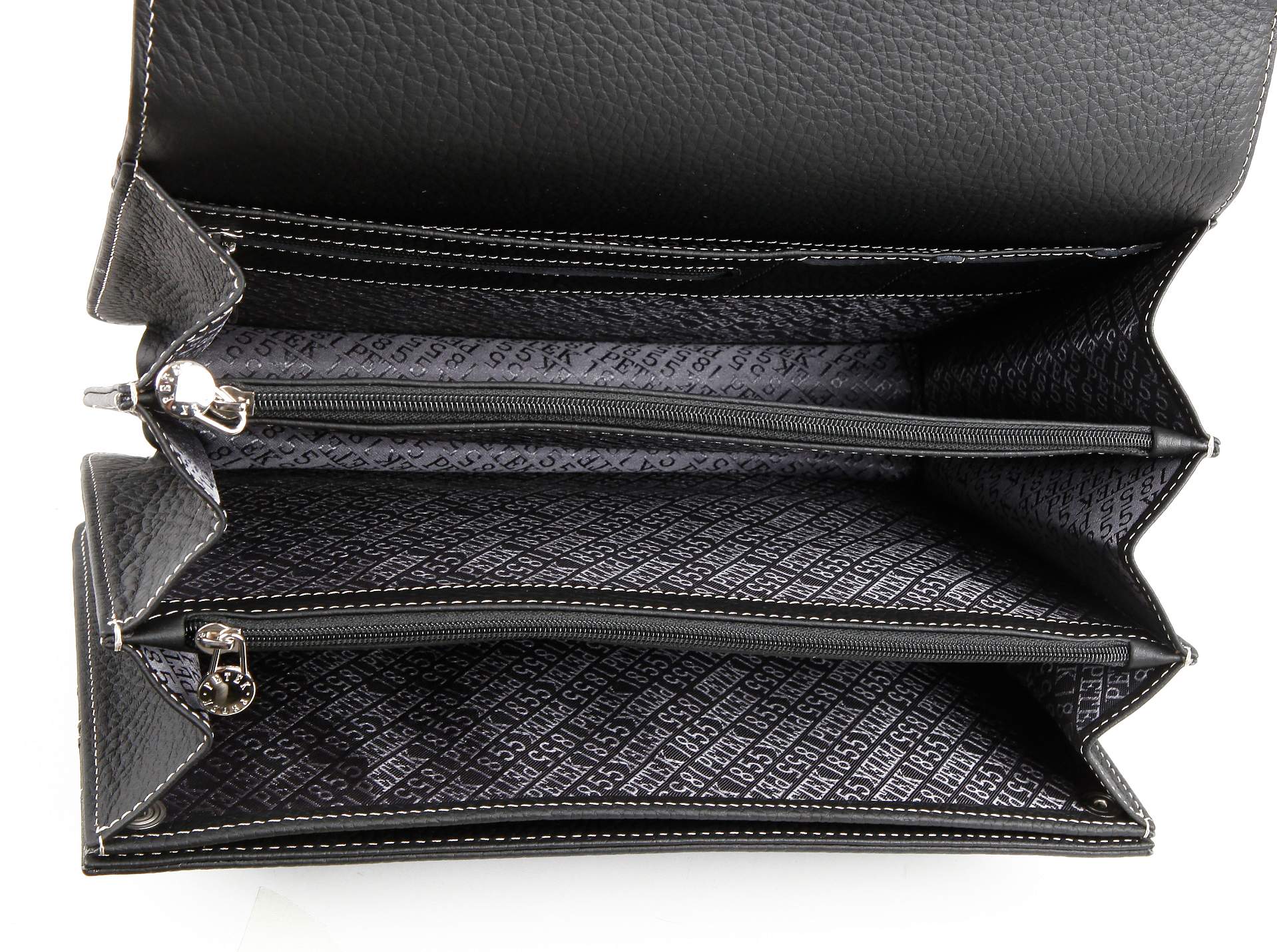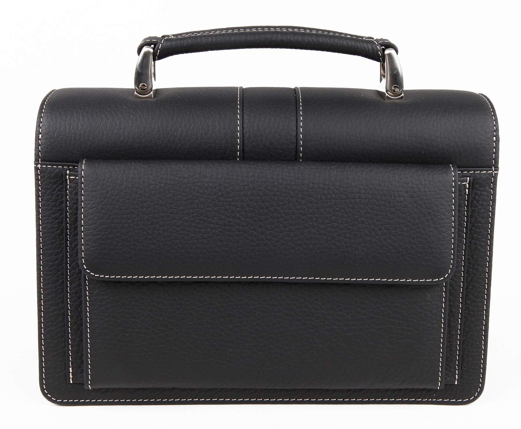 Мужская барсетка из натуральной кожи Petek с тремя внутренними отделениями, которые закрываются общим клапаном с кодовым замком. Внутри имеются три отсека, разделенные карманами на молнии, один карман на молнии и два отсека для ручек. Снаружи, на лицевой стороне, под клапаном находится откидной отсек на кнопках с дополнительными карманами и отделениями для визитных карт и пластиковых карт. На обратной стороне расположен карман с клапаном, барсетка оснащена удобной кожаной ручкой для переноски.