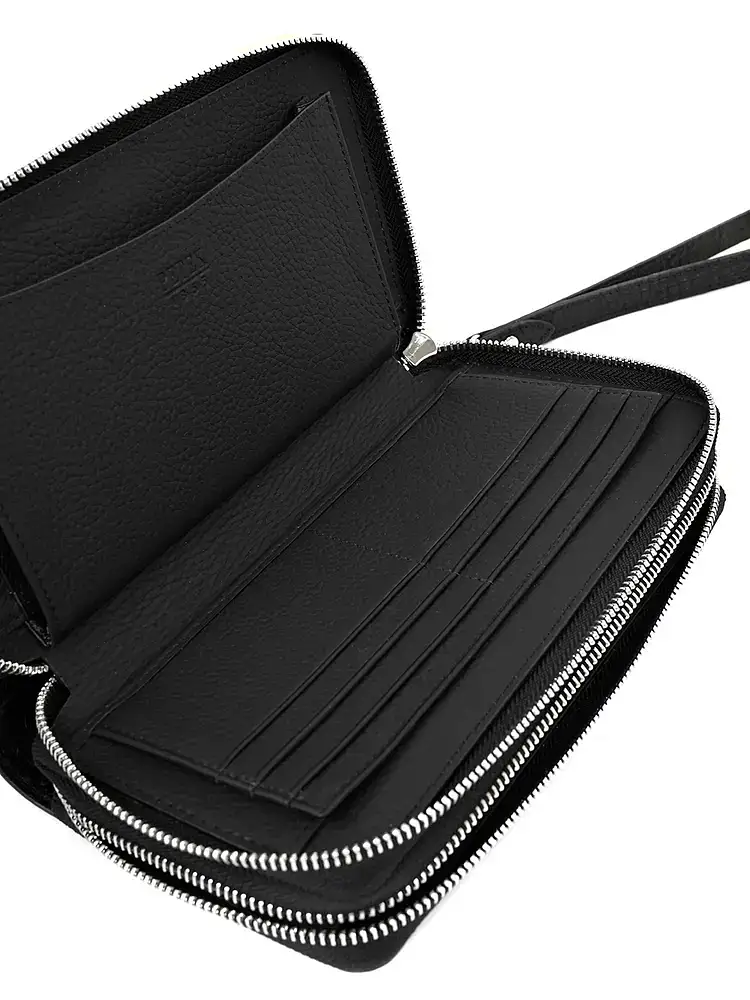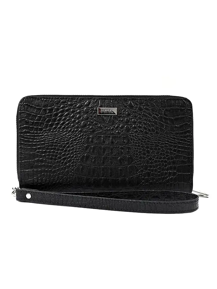 Клатч мужской Petek 1855 из натуральной кожи. Изделие состоит из двух частей закрывающихся на молнии. В одной части изделия находится отделение для телефона размеры: 17,5 х 9 х 2. ( помещается IPhone 15 Pro max с габаритным чехлом+).  8 карманов для карт, 1 доп. отделение под купюры, за карманами под карты. Во второй части изделия, выполнено 2 просторных отделения для купюр. 2 доп. отделения для купюр за карманами под карты. 16 карманов для карт. монетница на молнии. К изделию прилагается лямка (хлястик) для фиксации и носки на запястье.