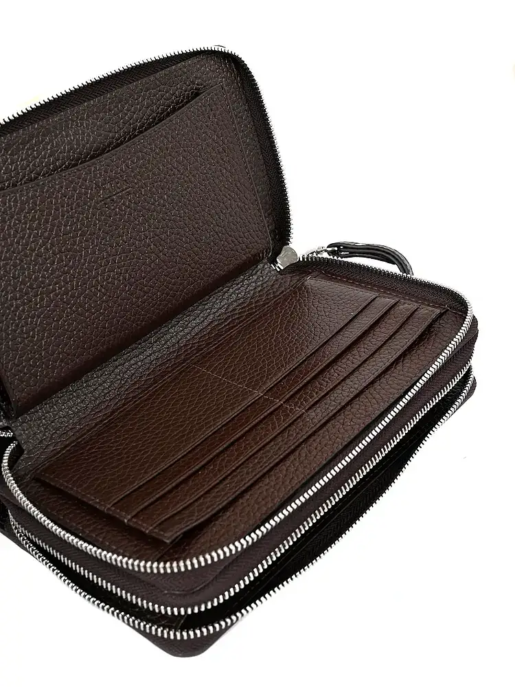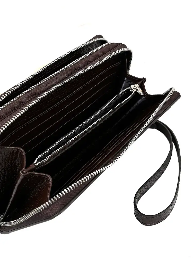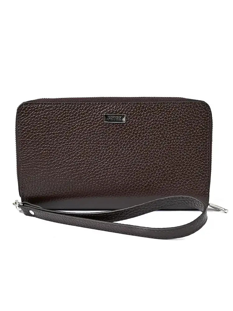 Клатч мужской Petek 1855 из натуральной кожи. Изделие состоит из двух частей закрывающихся на молнии. В одной части изделия находится отделение для телефона размеры: 17,5 х 9 х 2. ( помещается IPhone 15 Pro max с габаритным чехлом+).  8 карманов для карт, 1 доп. отделение под купюры, за карманами под карты. Во второй части изделия, выполнено 2 просторных отделения для купюр. 2 доп. отделения для купюр за карманами под карты. 16 карманов для карт. монетница на молнии. К изделию прилагается лямка (хлястик) для фиксации и носки на запястье.