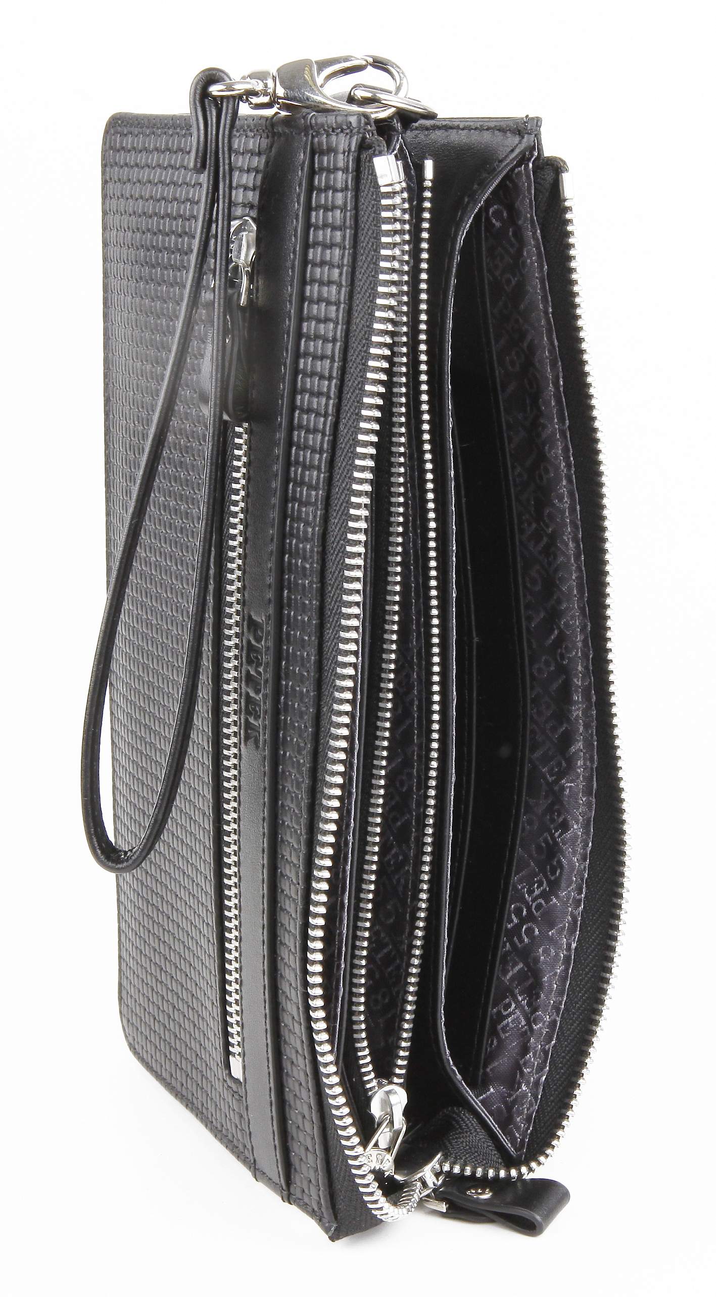 Мужская кожаная сумка-визитка Petek. Внутри 3 отделения, 1 из них на молнии, 8 отделений для пластиковых карт. Снаружи есть 1 карман на молнии и удобный ремешок для крепления на руку.