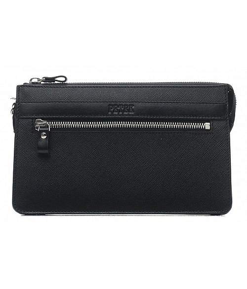 Кожаное портмоне-клатч от Petek имеет три отделения внутри, центральное из которых закрывается на молнию. В нем предусмотрено восемь отсеков для визиток и пластиковых карт, а также боковые карманы для других документов. На внешней стороне портмоне имеется карман на молнии и съемный ремешок для запястья. Также есть крепление для удобства ношения на ладони.