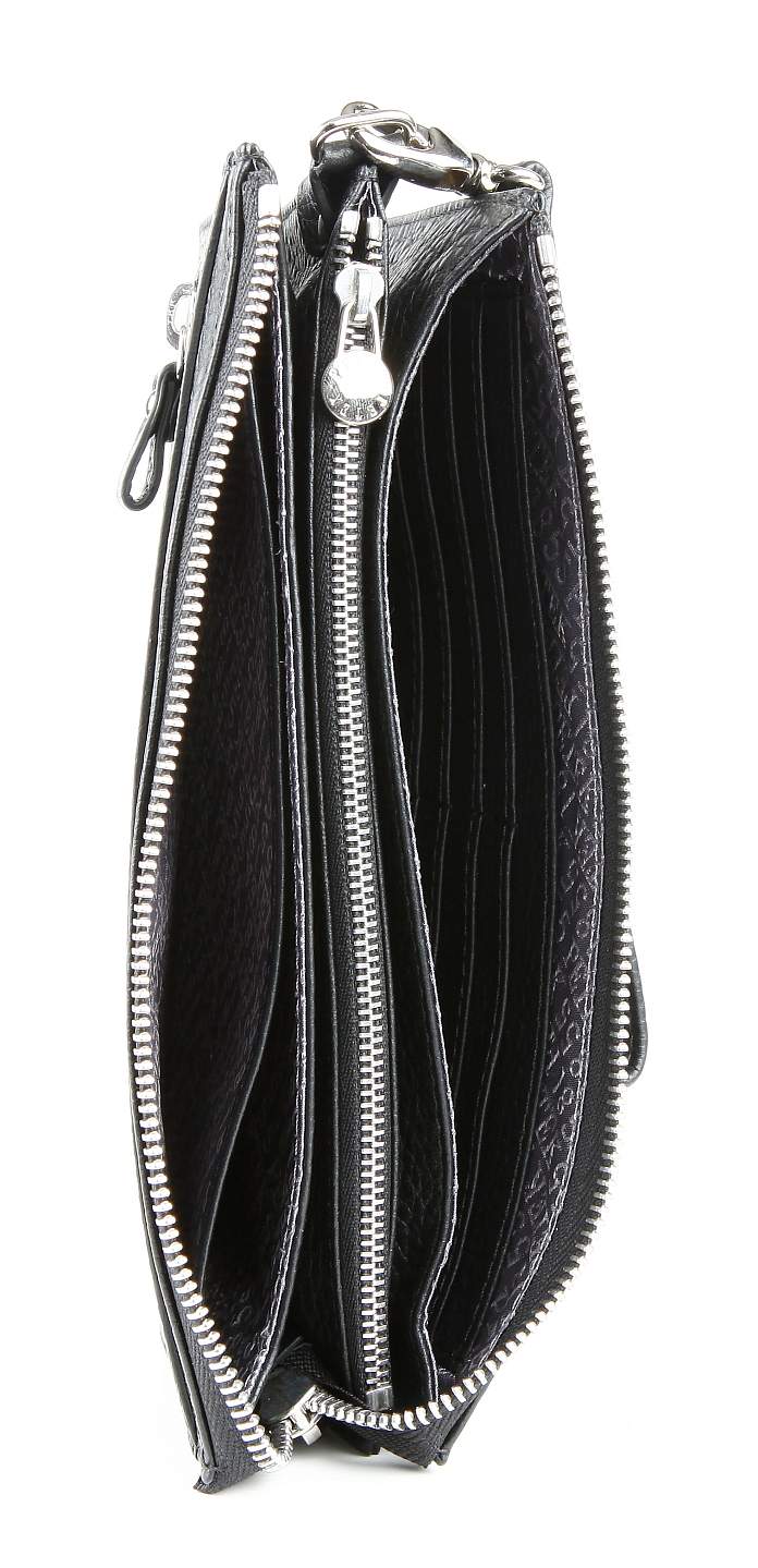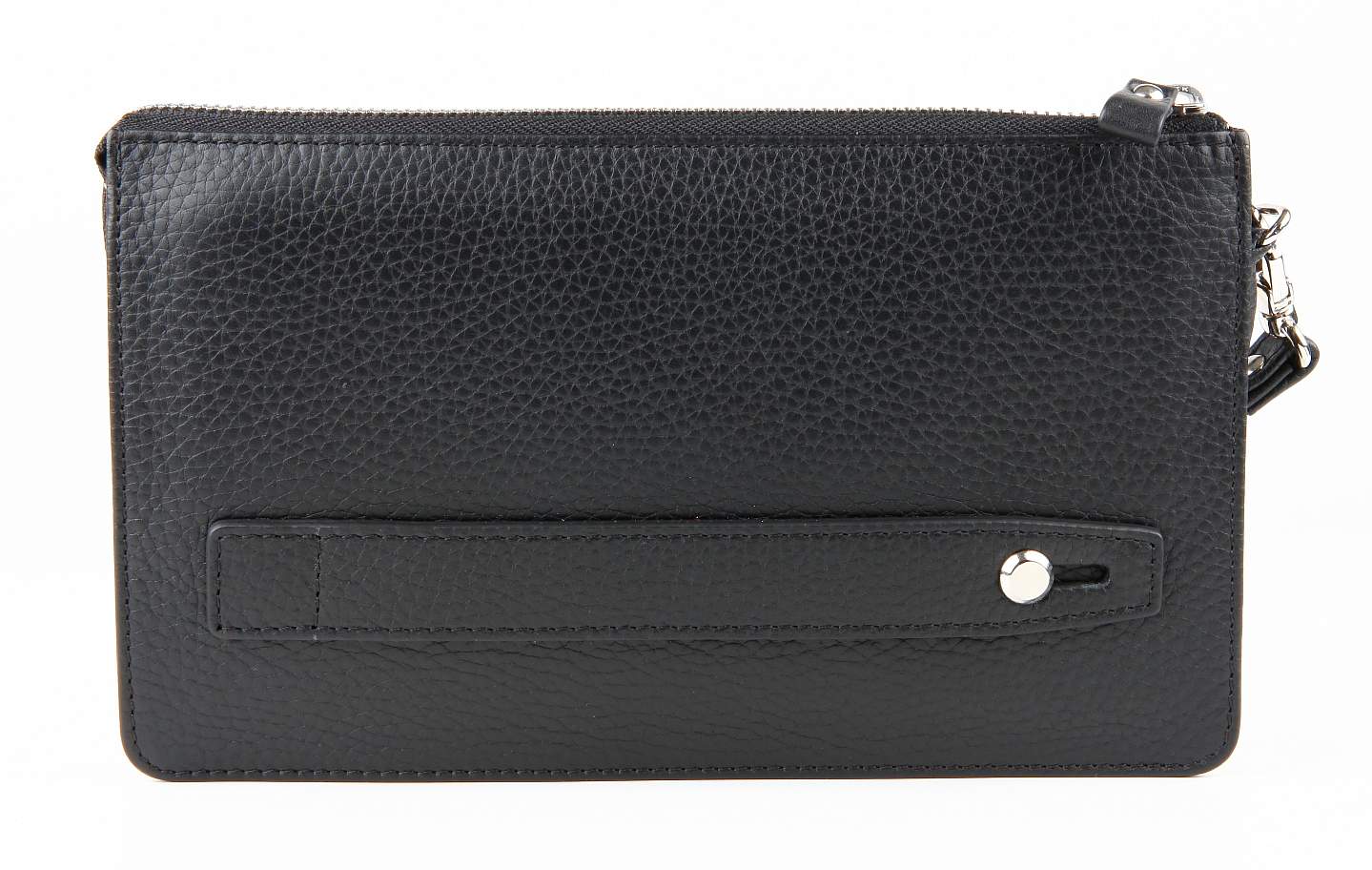 Кожаное портмоне-клатч от Petek имеет три отделения внутри, центральное из которых закрывается на молнию. В нем предусмотрено восемь отсеков для визиток и пластиковых карт, а также боковые карманы для других документов. На внешней стороне портмоне имеется карман на молнии и съемный ремешок для запястья. Также есть крепление для удобства ношения на ладони.