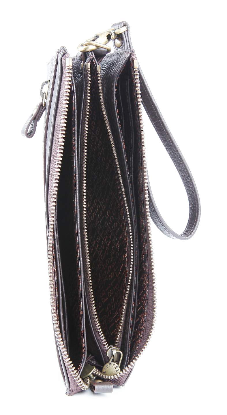 Мужская кожаная сумка-визитка Petek. Внутри 3 отделения, 1 из них на молнии, 8 отделений для пластиковых карт. Снаружи есть 1 карман на молнии и удобный ремешок для крепления на руку.