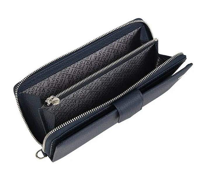 Портмоне-клатч Petek выполнено из натуральной кожи. Основное отделение закрывается на круговую молнию. Дополнительная откидная часть фиксируется кнопкой. Внутри портмоне имеет два отделения, разделенных молнией, и многофункциональный боковой карман. Боковой отсек содержит множество отделений для визиток, пластиковых карт и документов. Сзади портмоне имеется дополнительный карман на молнии. Дополнительно имеется ремешок на запястье для удобства ношения.