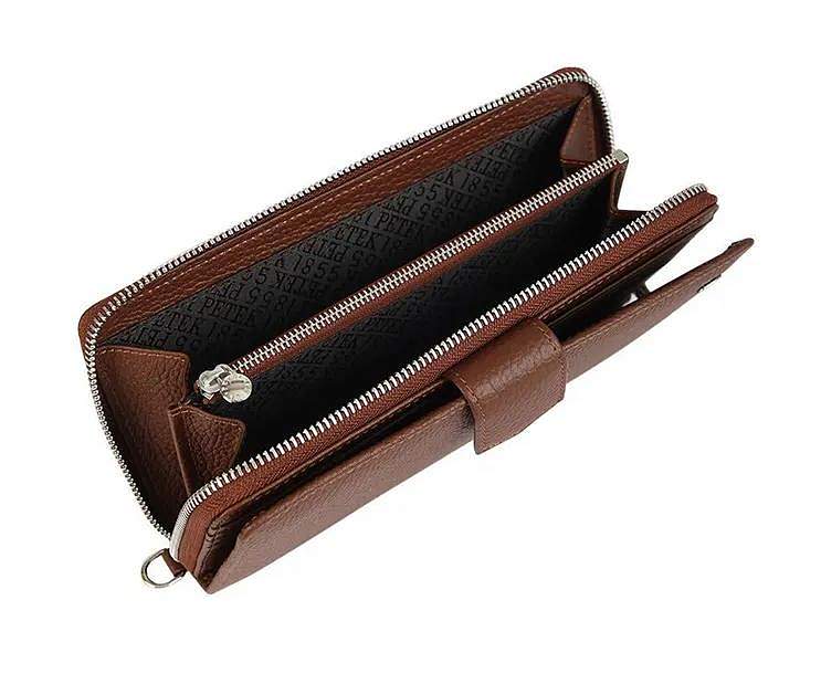 Портмоне-клатч Petek выполнено из натуральной кожи. Основное отделение закрывается на круговую молнию. Дополнительная откидная часть фиксируется кнопкой. Внутри портмоне имеет два отделения, разделенных молнией, и многофункциональный боковой карман. Боковой отсек содержит множество отделений для визиток, пластиковых карт и документов. Сзади портмоне имеется дополнительный карман на молнии. Дополнительно имеется ремешок на запястье для удобства ношения.