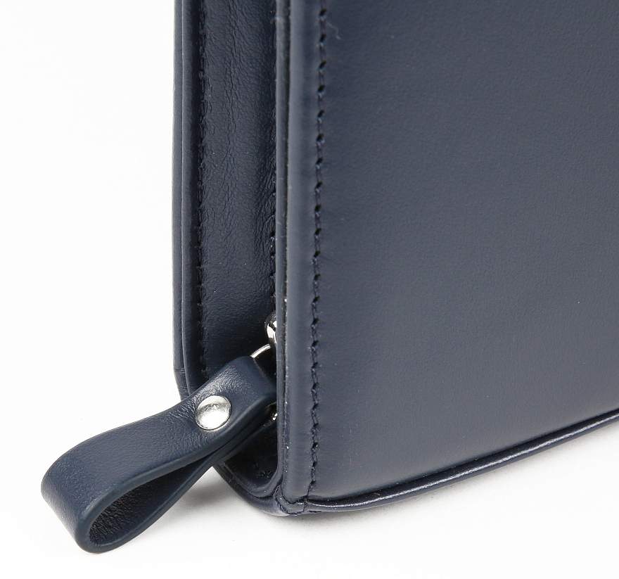 Папка из натуральной кожи. Компактная и стильная модель. Закрывается на молнию по периметру; внутри: три больших отдела; на передней стенке первого отдела три отделения для ручек; на задней стенке третьего отдела один объемный карман для документов на молнии, два кармана для дискет.