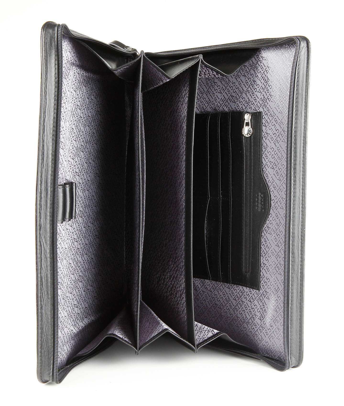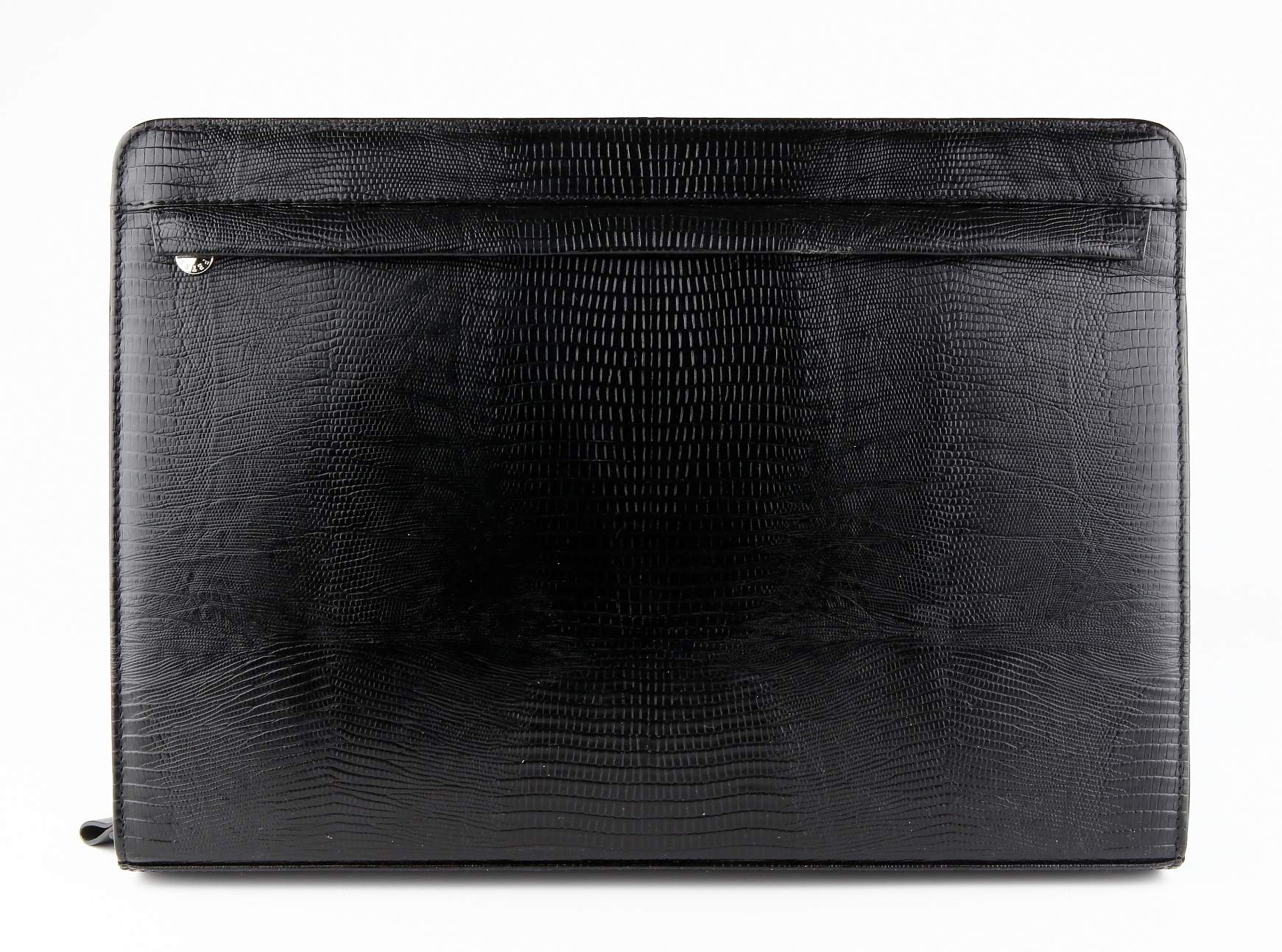 Папка из натуральной кожи. Компактная и стильная модель. Закрывается на молнию по периметру; внутри: три больших отдела; на передней стенке первого отдела три отделения для ручек; на задней стенке третьего отдела один объемный карман для документов на молнии, два кармана для дискет.