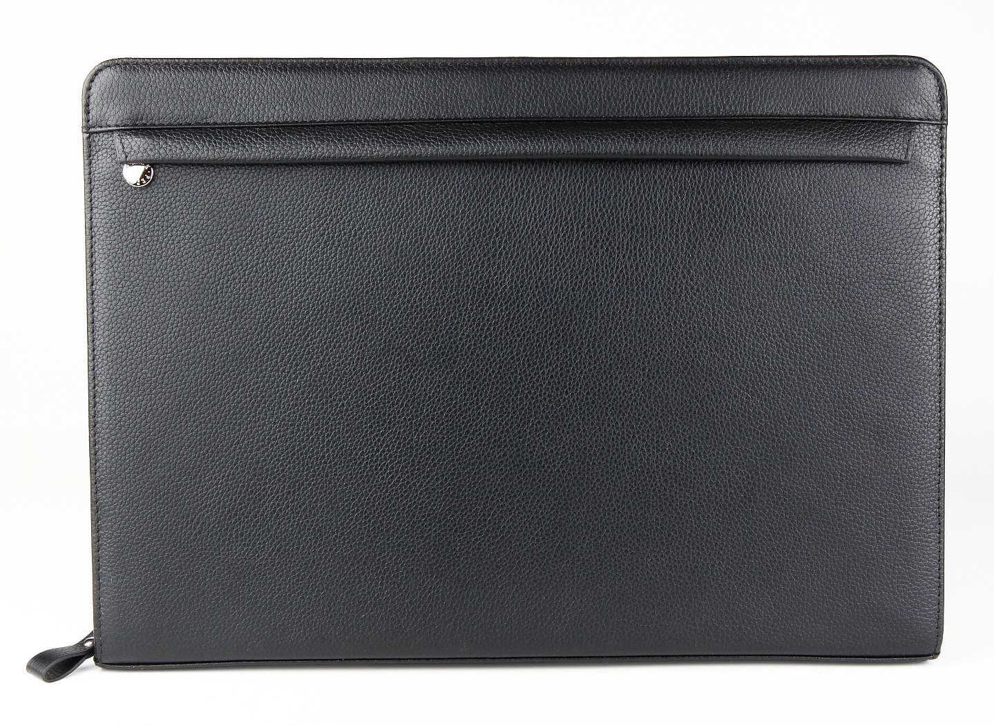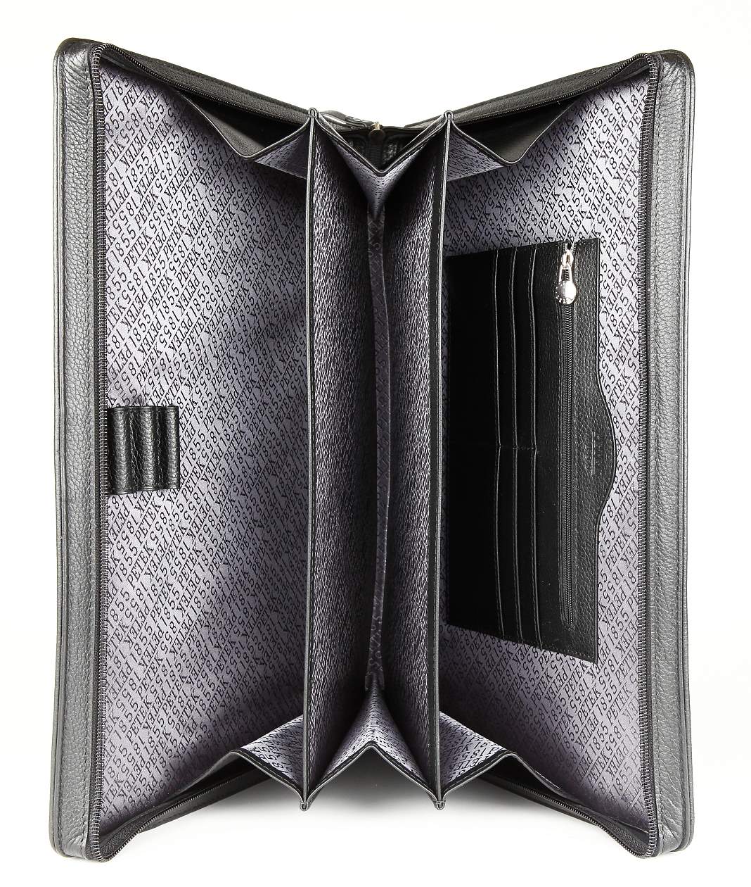 Папка из натуральной кожи. Компактная и стильная модель. Закрывается на молнию по периметру; внутри: три больших отдела; на передней стенке первого отдела три отделения для ручек; на задней стенке третьего отдела один объемный карман для документов на молнии, два кармана для дискет.