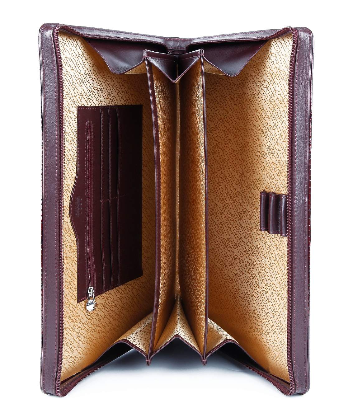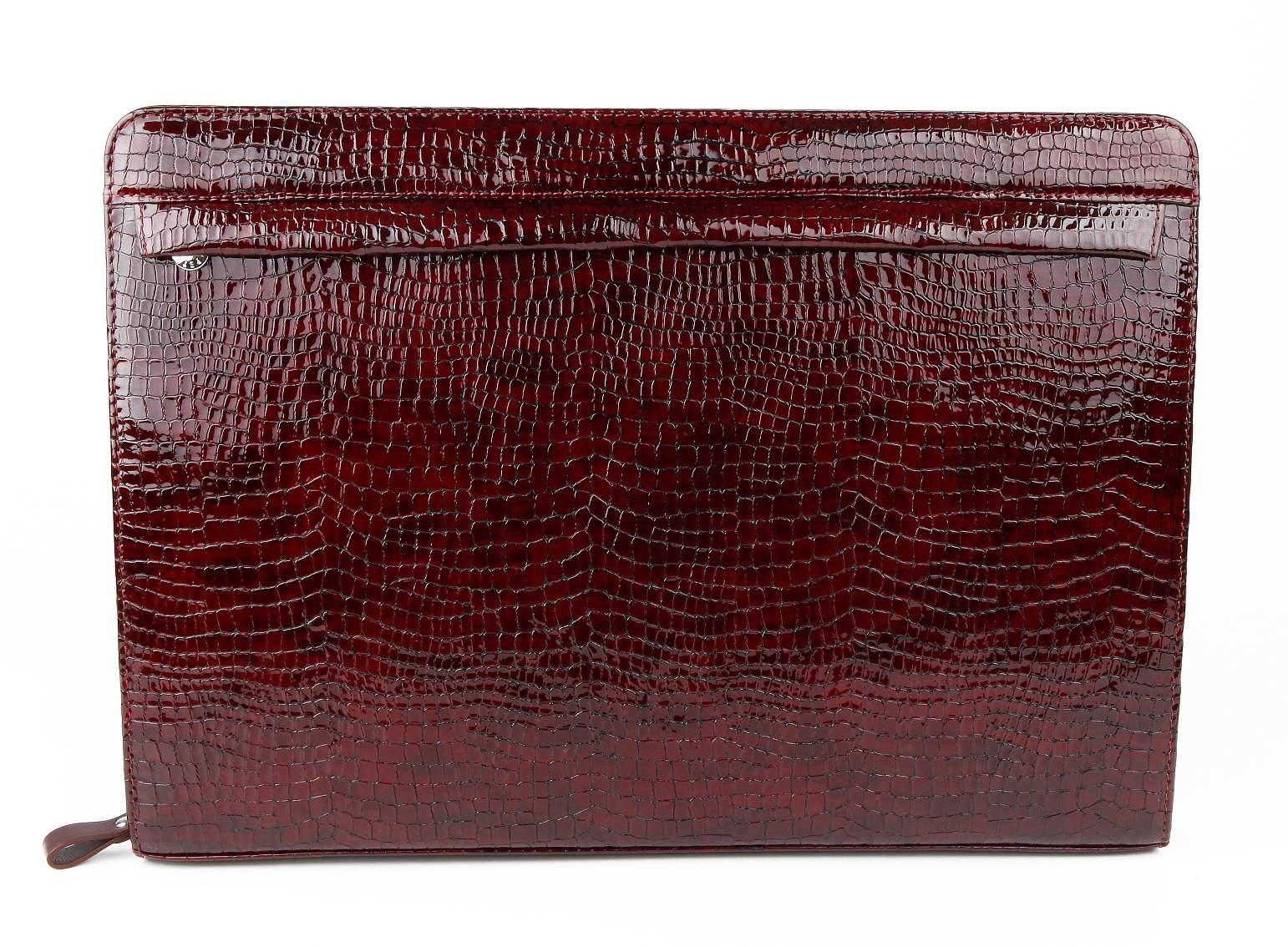 Папка из натуральной кожи. Компактная и стильная модель. Закрывается на молнию по периметру; внутри: три больших отдела; на передней стенке первого отдела три отделения для ручек; на задней стенке третьего отдела один объемный карман для документов на молнии, два кармана для дискет.