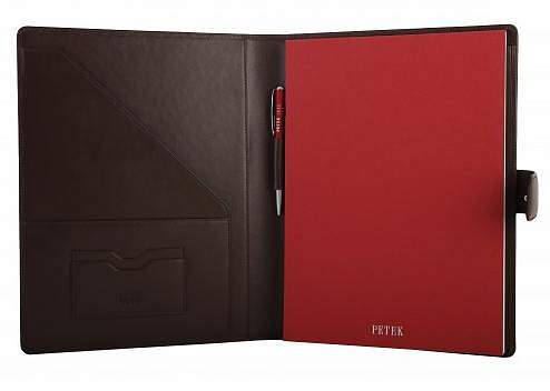 Папка из натуральной кожи. Удобный современный бизнес-аксессуар. Закрывается клапаном с кнопкой. Внутри на передней стенке: два кармана для бумаг формата А4, один карман для бумаг формата А5, два кармашка для кредитных или визитных карт. Внутри на задней стенке: сменный блокнот формата А4, отделение для ручки.