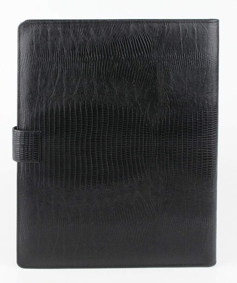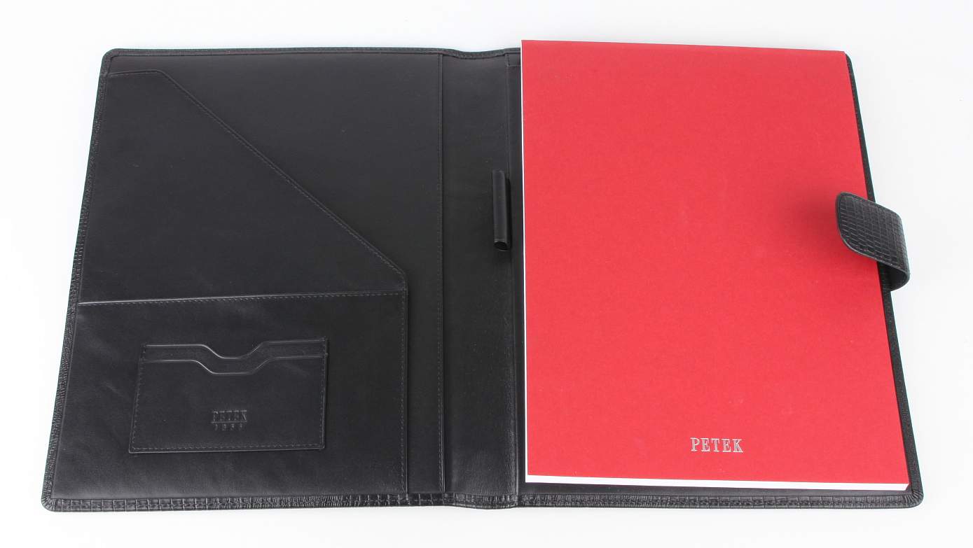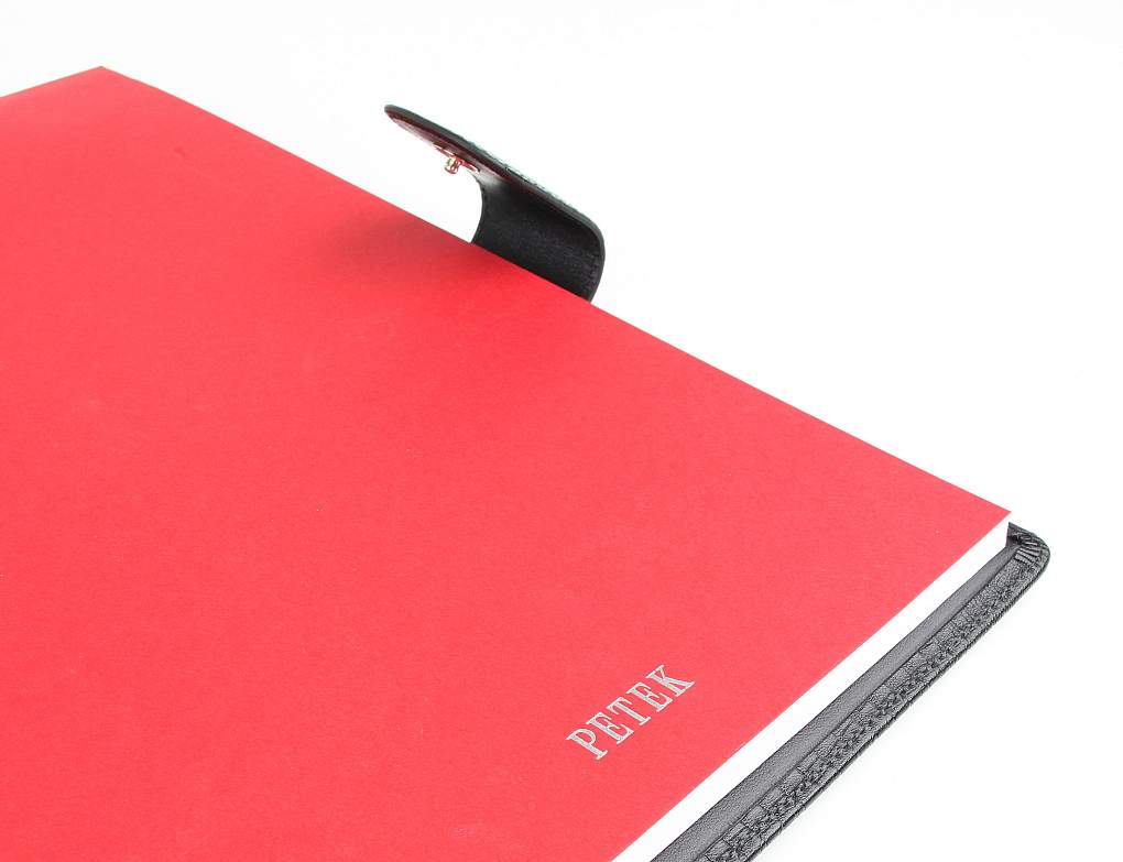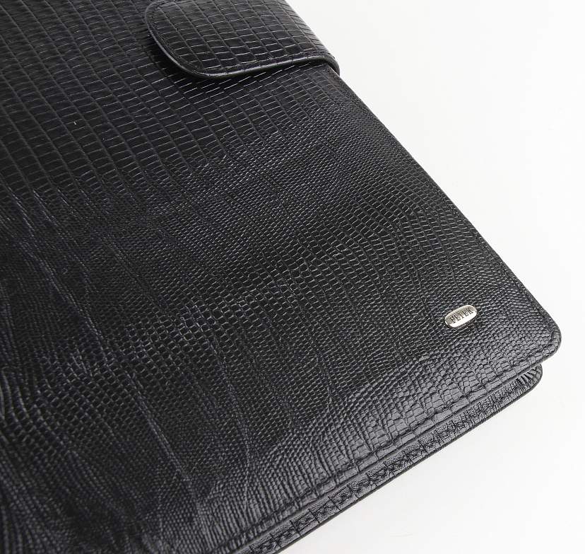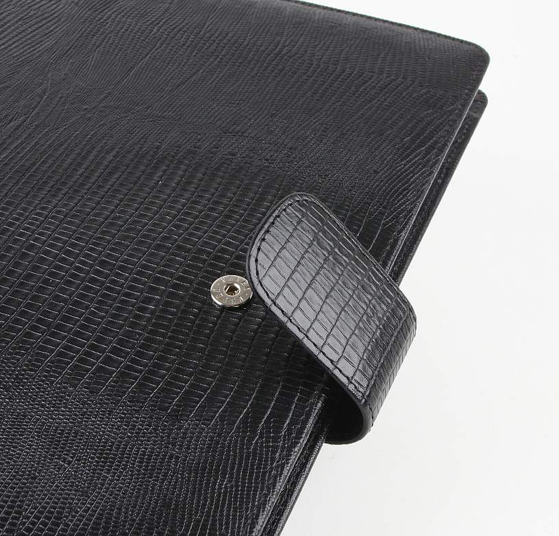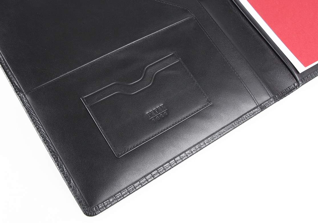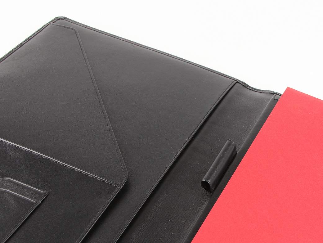 Папка из натуральной кожи. Удобный современный бизнес-аксессуар. Закрывается клапаном с кнопкой. Внутри на передней стенке: два кармана для бумаг формата А4, один карман для бумаг формата А5, два кармашка для кредитных или визитных карт. Внутри на задней стенке: сменный блокнот формата А4, отделение для ручки.