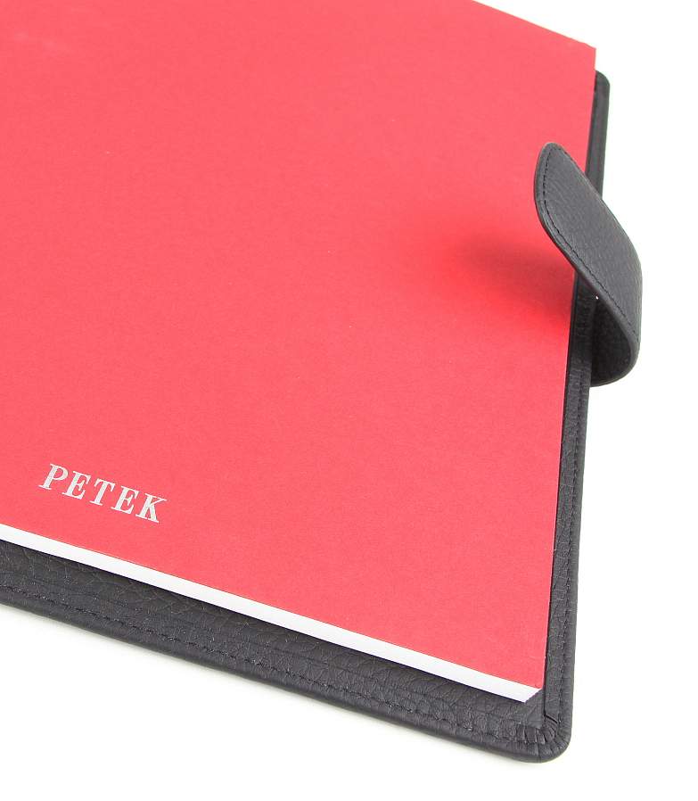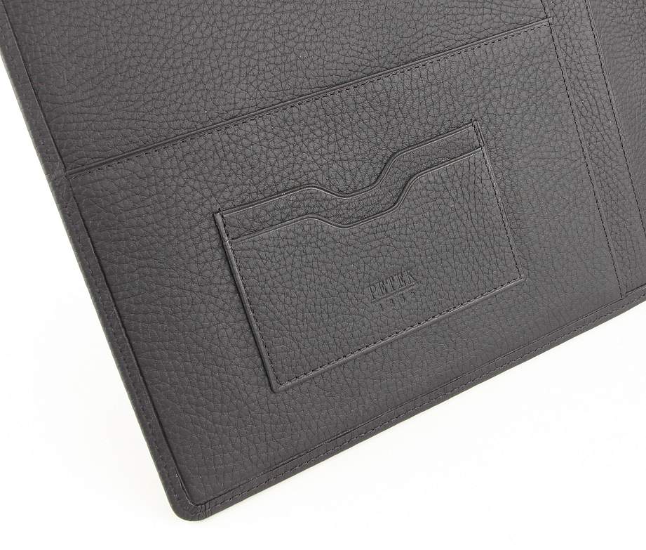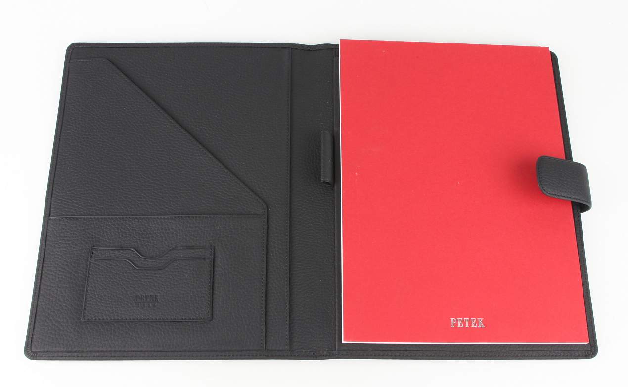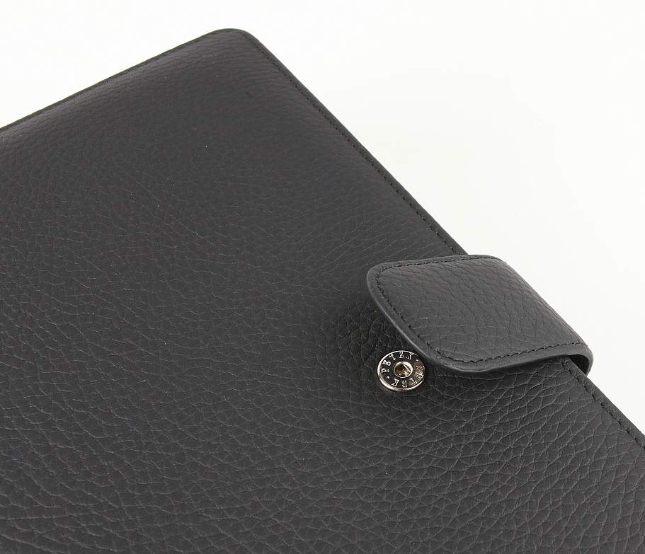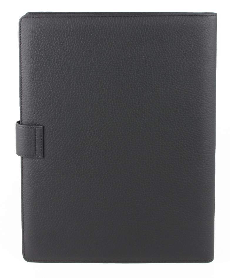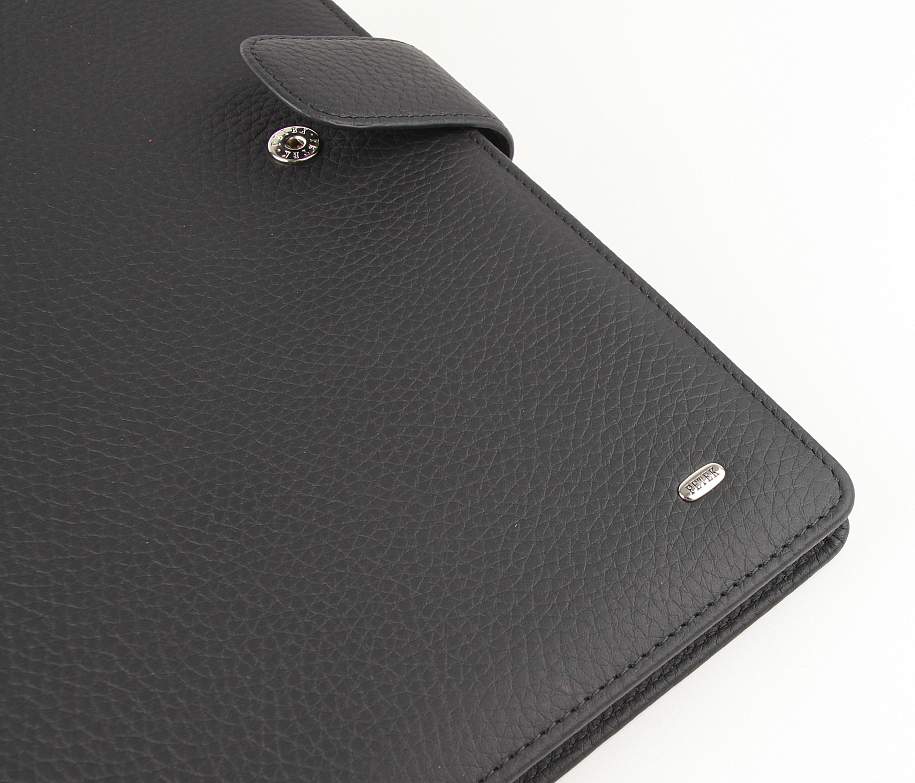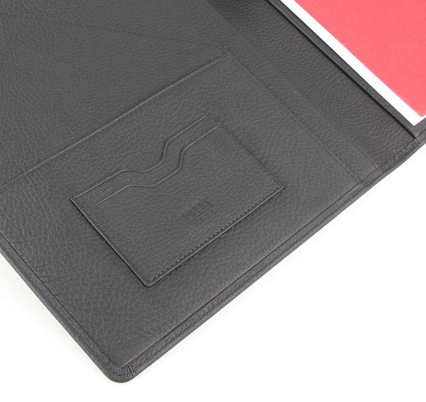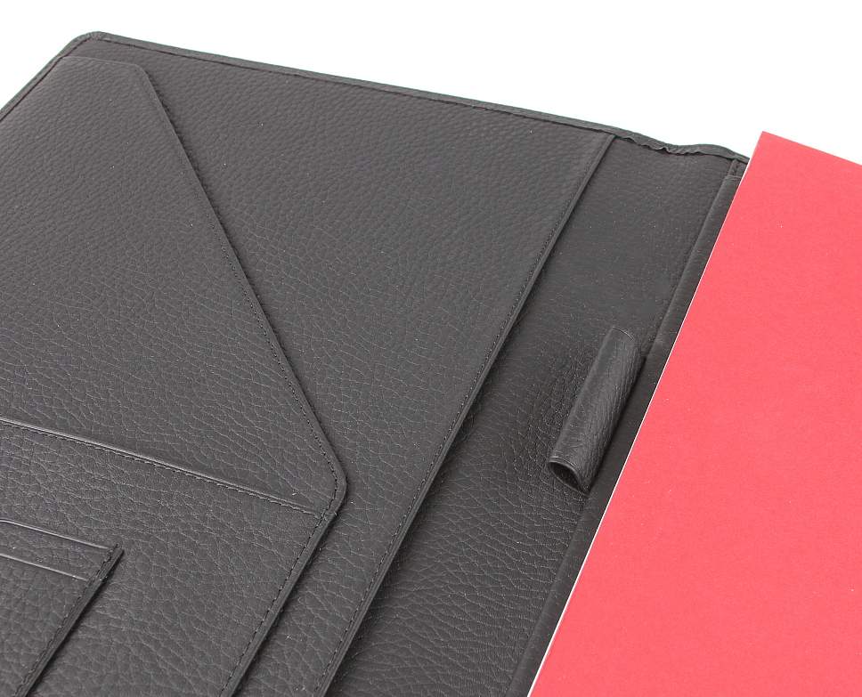 Папка из натуральной кожи. Удобный современный бизнес-аксессуар. Закрывается клапаном с кнопкой. Внутри на передней стенке: два кармана для бумаг формата А4, один карман для бумаг формата А5, два кармашка для кредитных или визитных карт. Внутри на задней стенке: сменный блокнот формата А4, отделение для ручки.