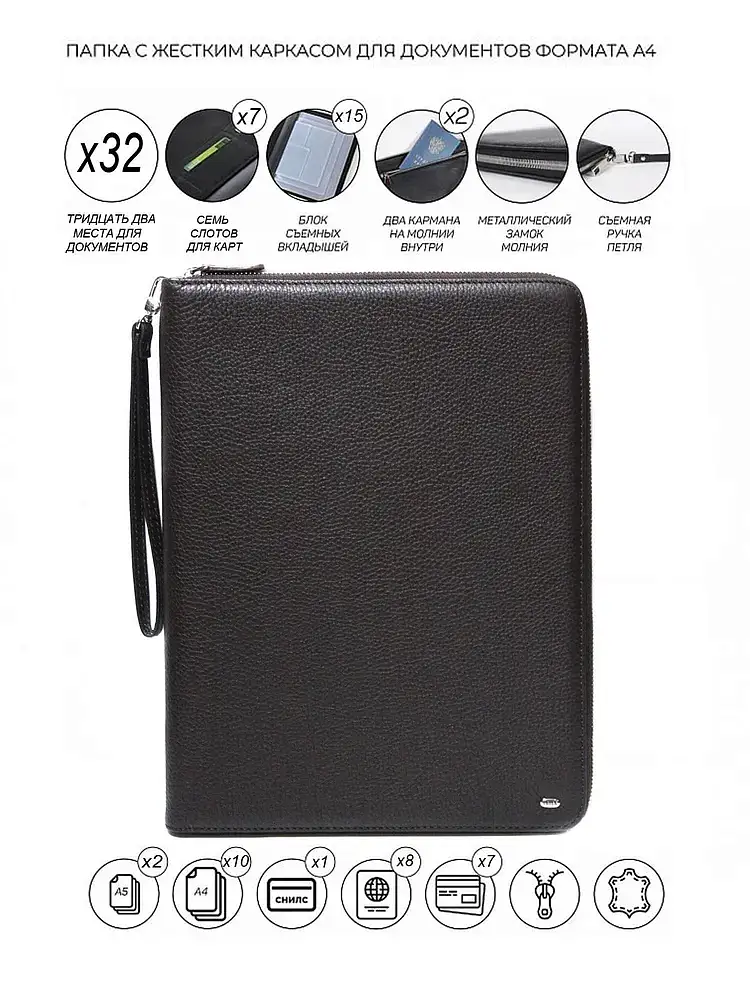 Эта папка оснащена 32 отделениями, включая 4 отделения под паспорт, 6 отделений для пластиковых карт, 2 отделения на молнии и 1 отделение для Снилс. Внутри папки также имеется вкладыш, который позволяет организовать хранение документов наиболее удобным образом.