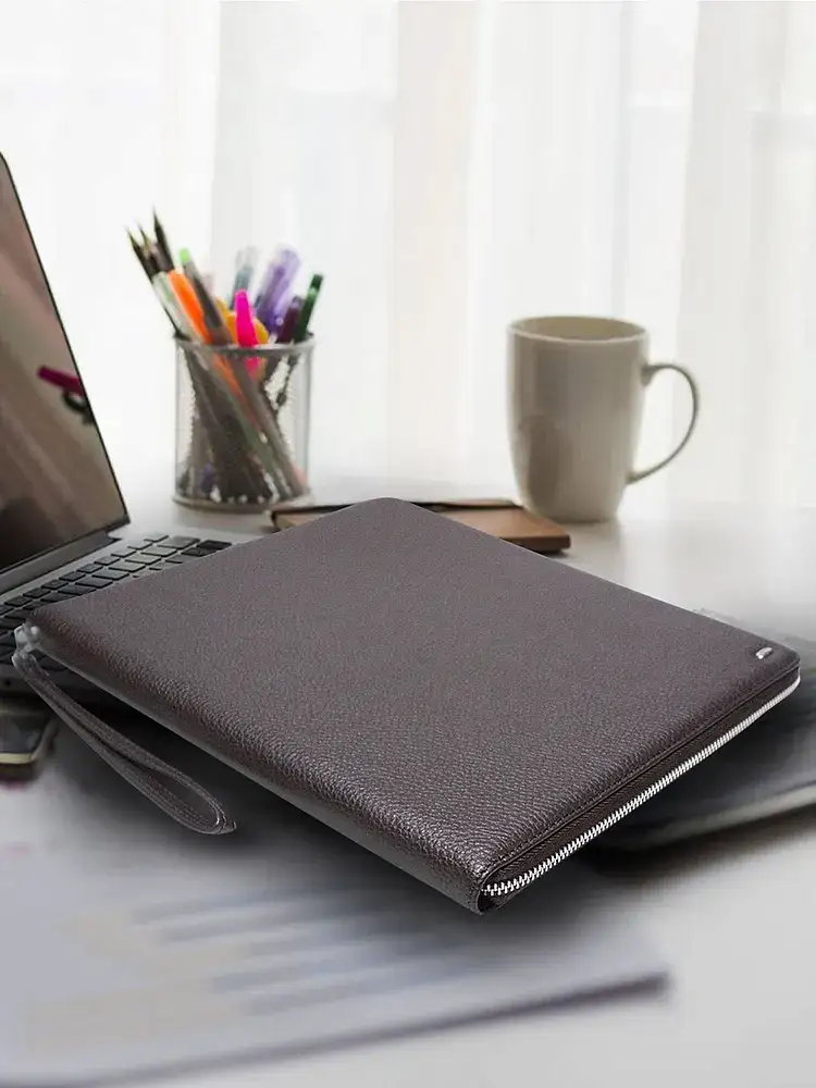 Папка закрывается на молнию, что обеспечивает надежное хранение документов и предотвращает их потерю. Съемный ремешок позволяет носить папку на плече или через плечо, делая ее удобной для использования в повседневной жизни.