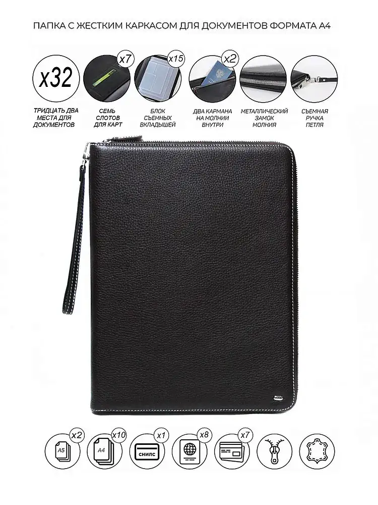 Эта папка оснащена 32 отделениями, включая 4 отделения под паспорт, 6 отделений для пластиковых карт, 2 отделения на молнии и 1 отделение для Снилс. Внутри папки также имеется вкладыш, который позволяет организовать хранение документов наиболее удобным образом.