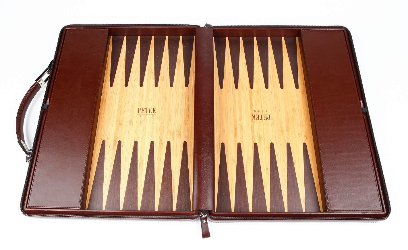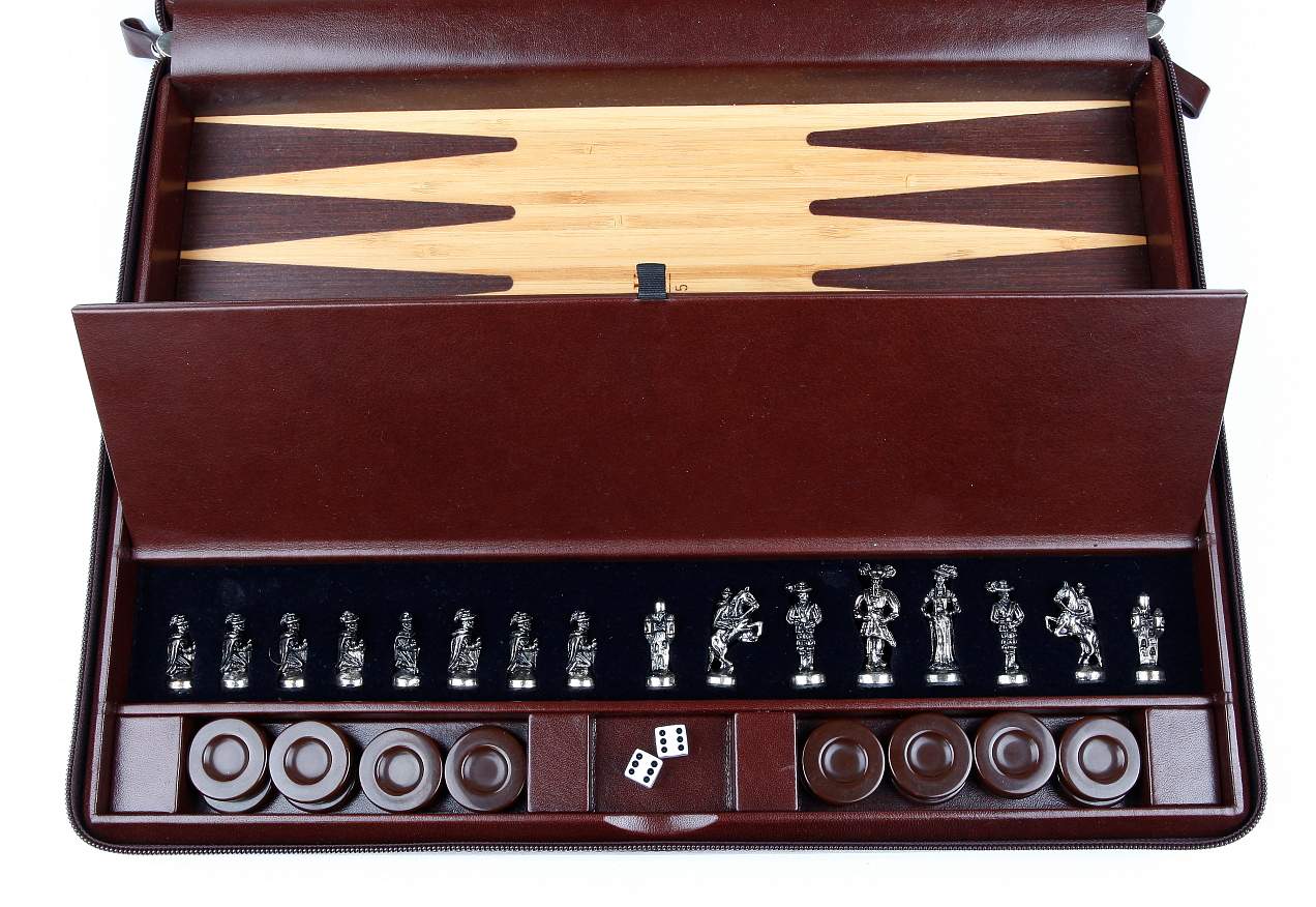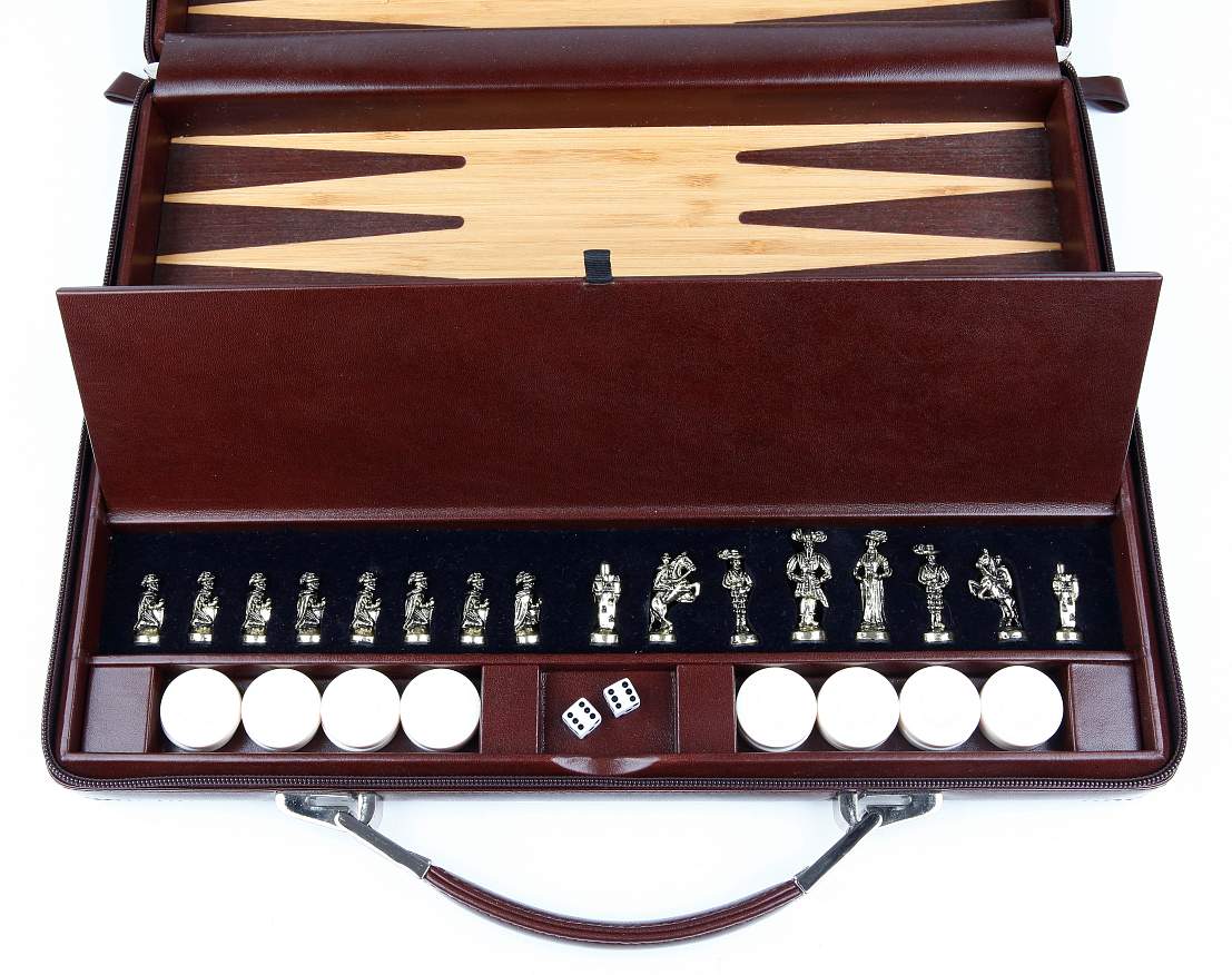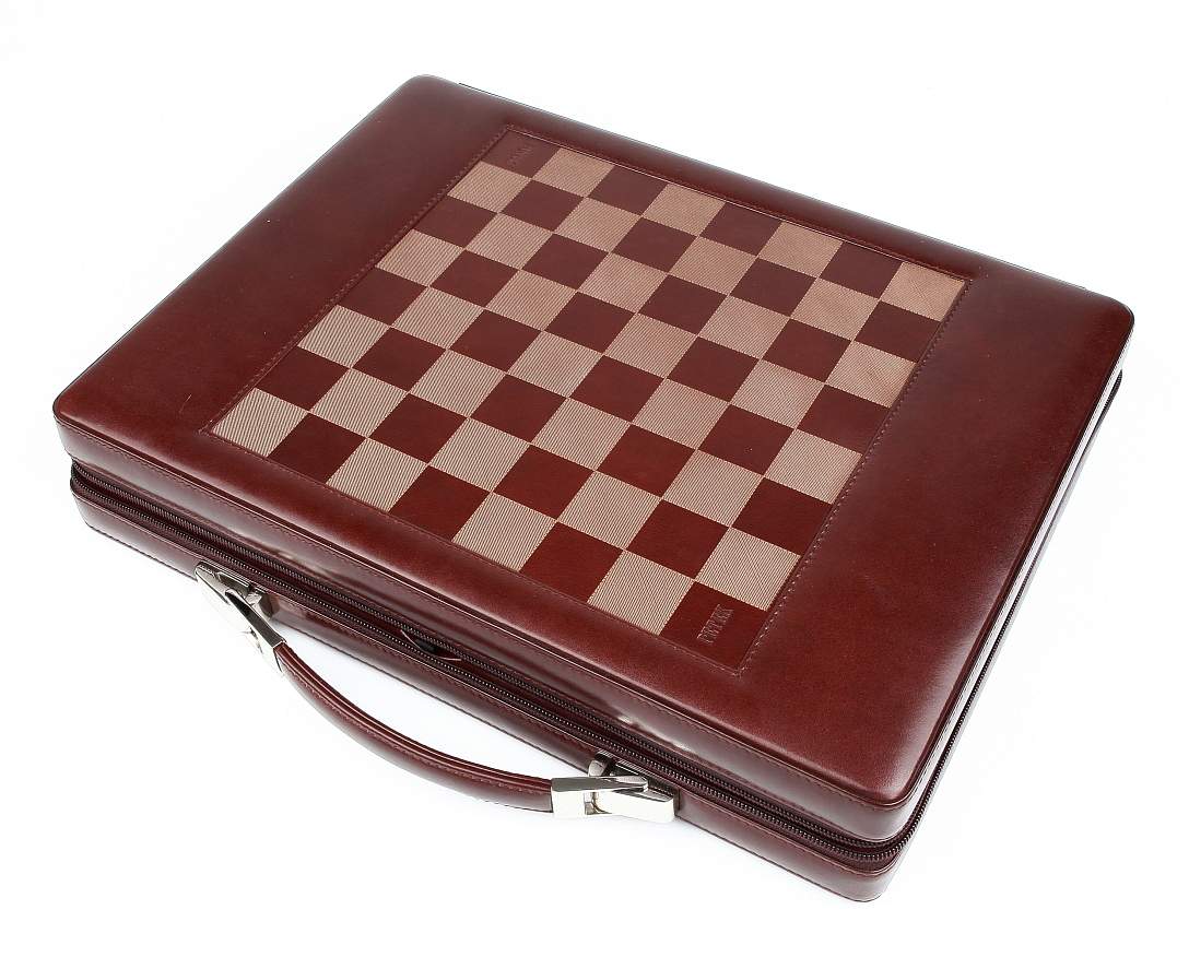 Закрываются на молнию, образуя своеобразную папку, которую легко переносить. Ручка портфельного типа с двумя фиксированными положениями. Кожаное игровое поле для шахмат или шашек. Деревянное игровое поле для нард. Металлические шахматные фигуры. Пластмассовые шашки и кубики для игры в нарды. 2 отсека на магнитах для хранения игровых принадлежностей.