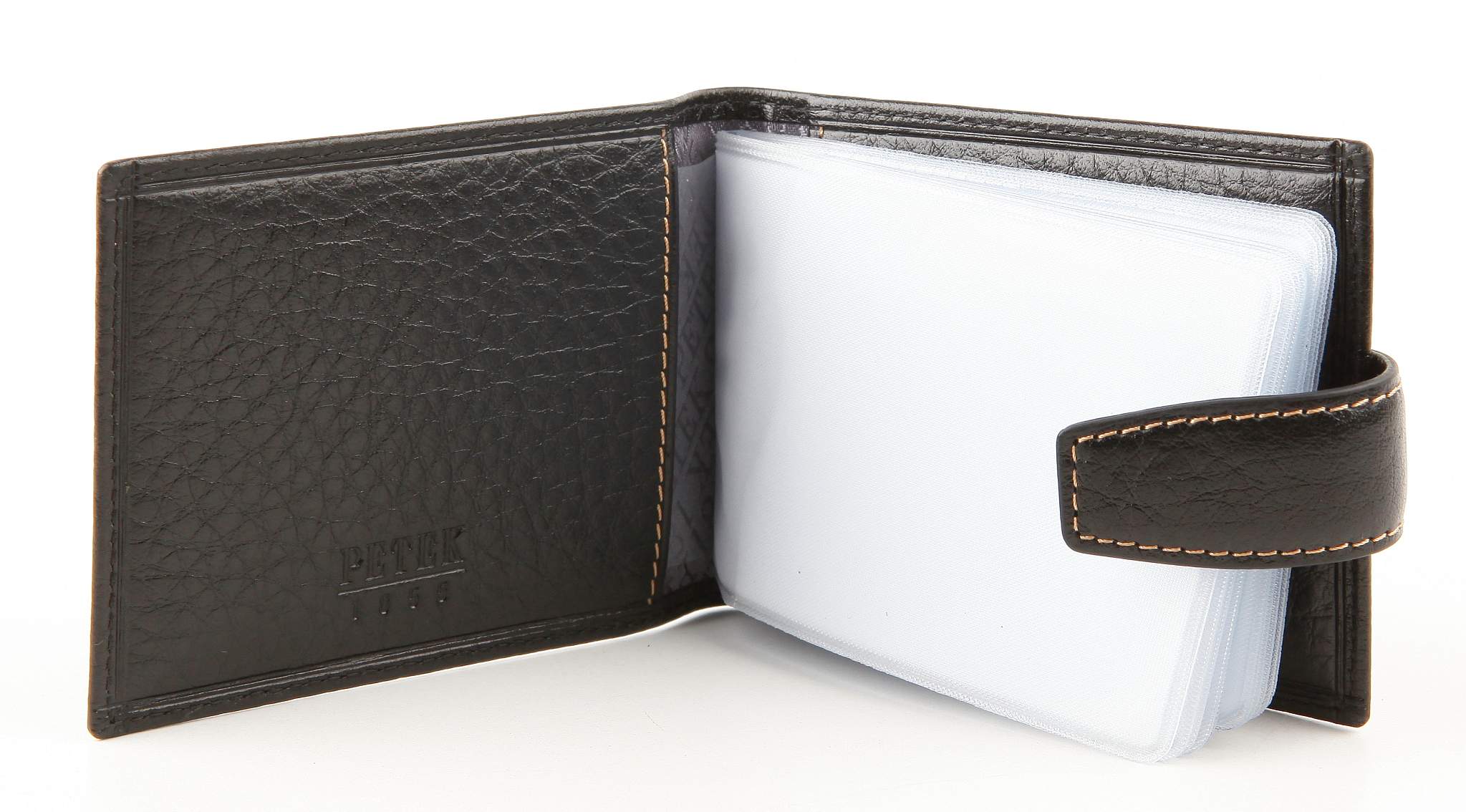 Визитница PETEK изготовлена из высококачественной натуральной кожи и отличается утонченным, стильным дизайном. Этот практичный аксессуар оснащен кнопкой для надежного закрытия. Визитницу можно открыть горизонтально, внутри находится десять прозрачных, прочных файлов для визиток. Блок с файлами можно извлечь из кожаной обложки, что очень удобно при использовании. Представленная модель визитницы идеально подойдет для хранения до десяти визитных карт при одностороннем расположении и до двадцати при двустороннем.