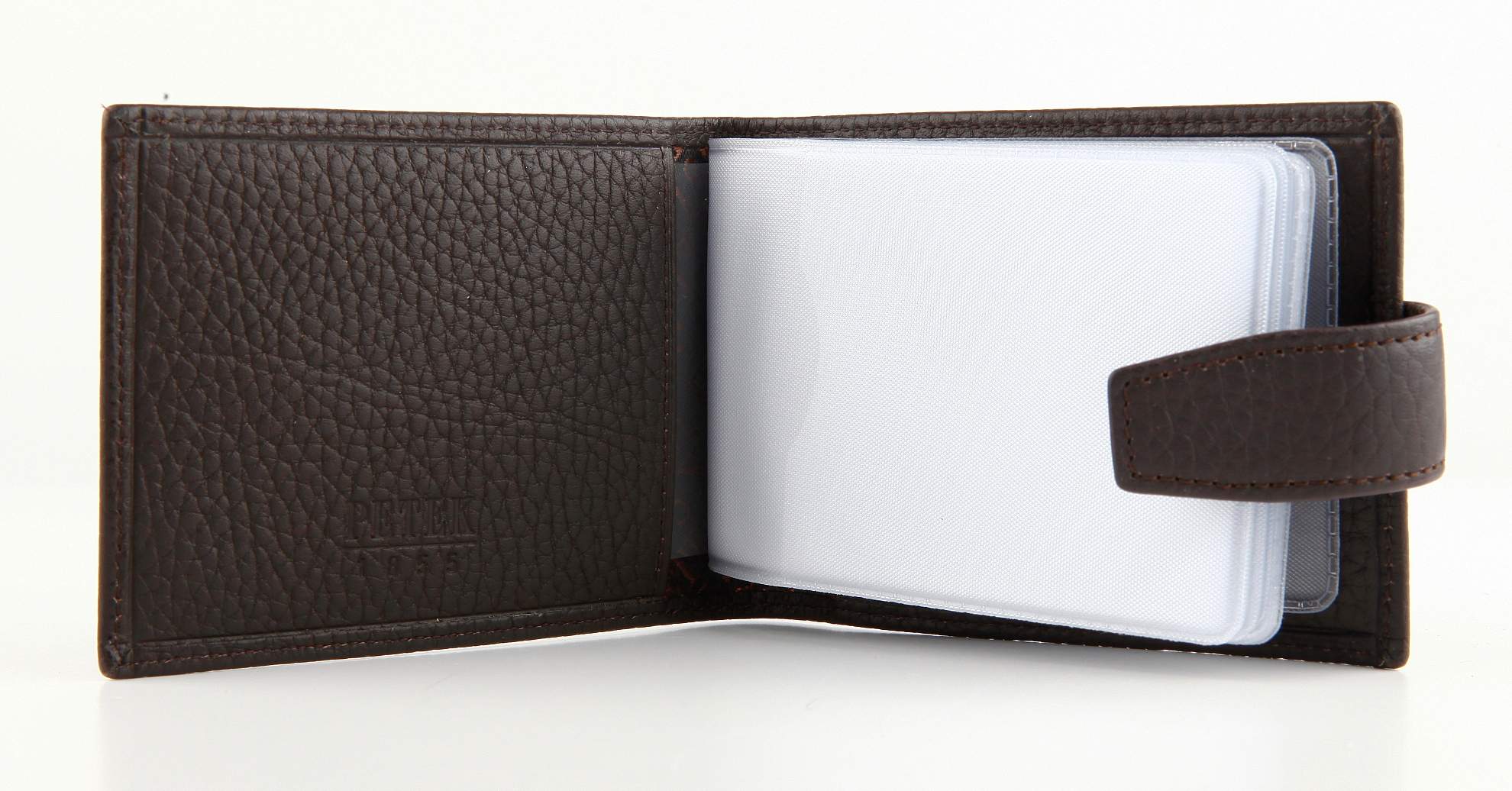 Визитница PETEK изготовлена из высококачественной натуральной кожи и отличается утонченным, стильным дизайном. Этот практичный аксессуар оснащен кнопкой для надежного закрытия. Визитницу можно открыть горизонтально, внутри находится десять прозрачных, прочных файлов для визиток. Блок с файлами можно извлечь из кожаной обложки, что очень удобно при использовании. Представленная модель визитницы идеально подойдет для хранения до десяти визитных карт при одностороннем расположении и до двадцати при двустороннем.