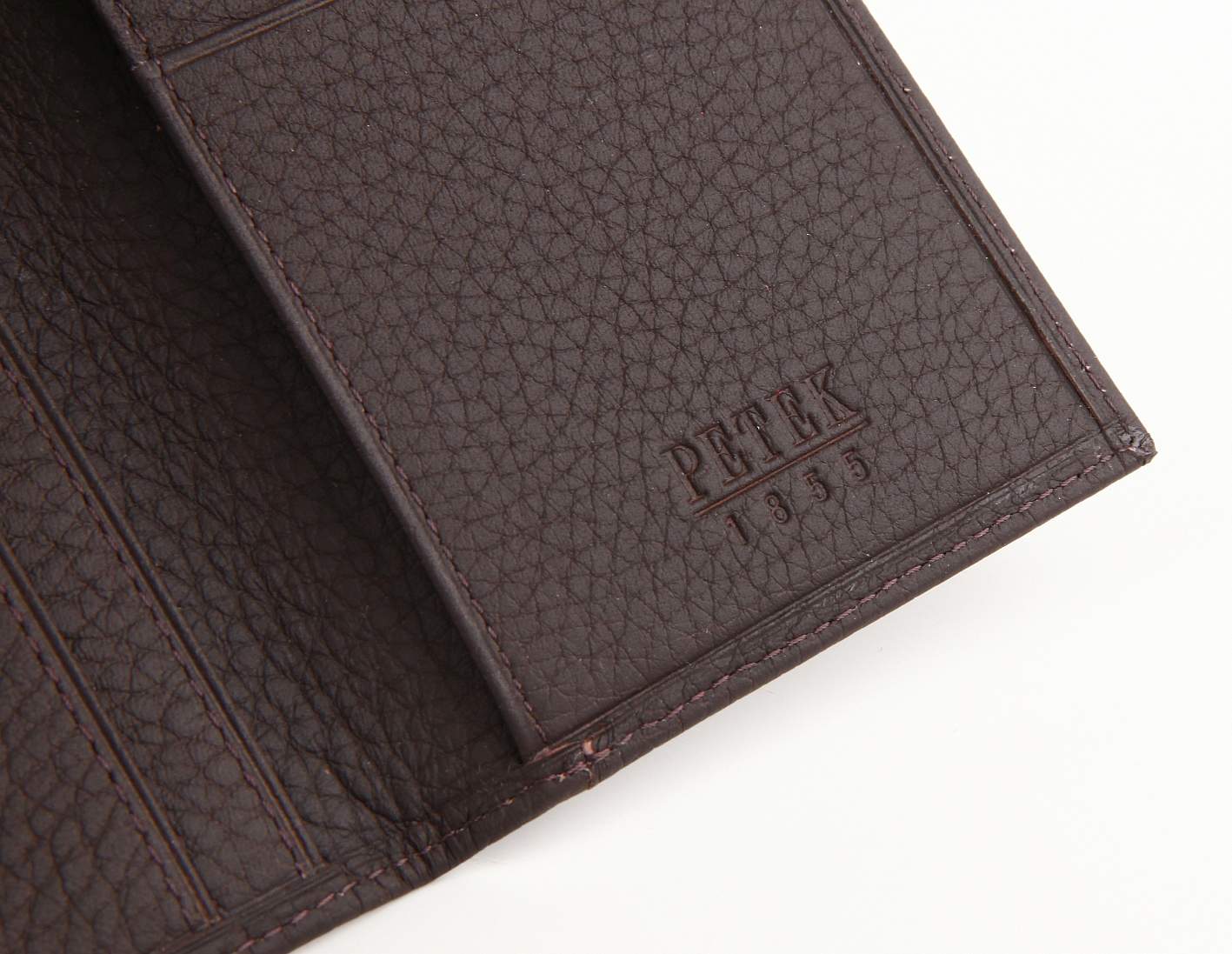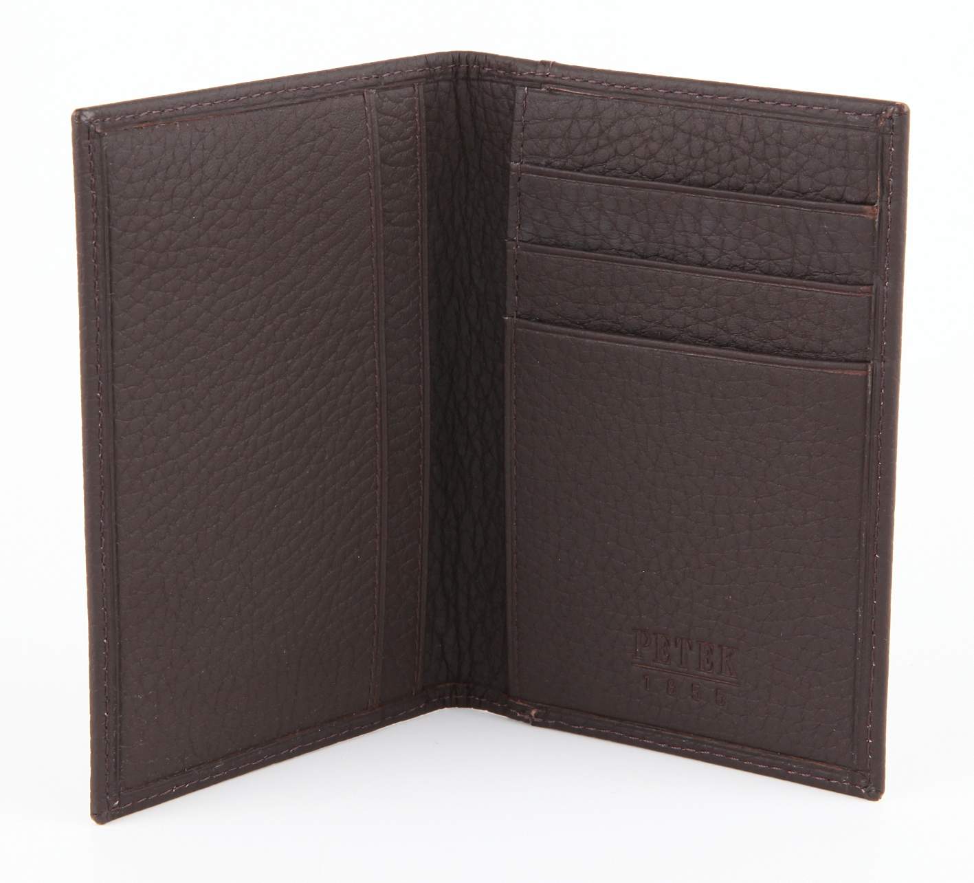 Визитница PETEK изготовлена из натуральной кожи высшего качества. Лицевая сторона изделия украшена небольшой металлической пластиной с гравировкой логотипа бренда. Внутри находятся удобные кармашки для хранения визиток или пластиковых карт. Застежки не предусмотрено, что делает использование визитницы максимально удобным.