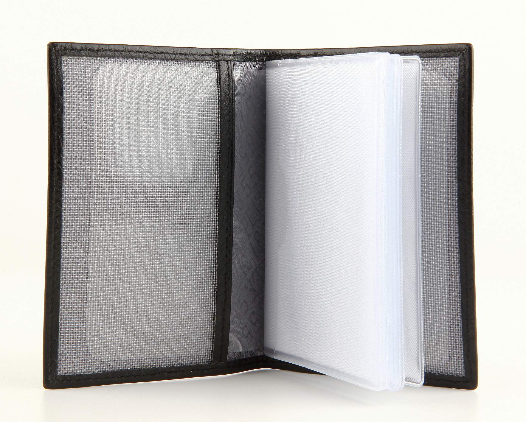 Закрывается без застежки. 8 двухсторонних отделений для визитных и кредитных карт.