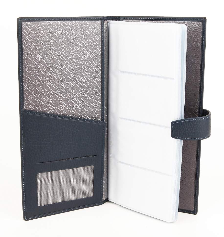 Настольная визитница из натуральной кожи высокого качества. Внутри имеется блок для визиток из 20 плотных пластиковых файлов по 4 отделения. Блок легко вынимается из кожаной обложки. При двустороннем размещении в визитницу помещается 160 карточек. На кожаной обложке внутри имеется дополнительный кармашек и уголок для бумаг.