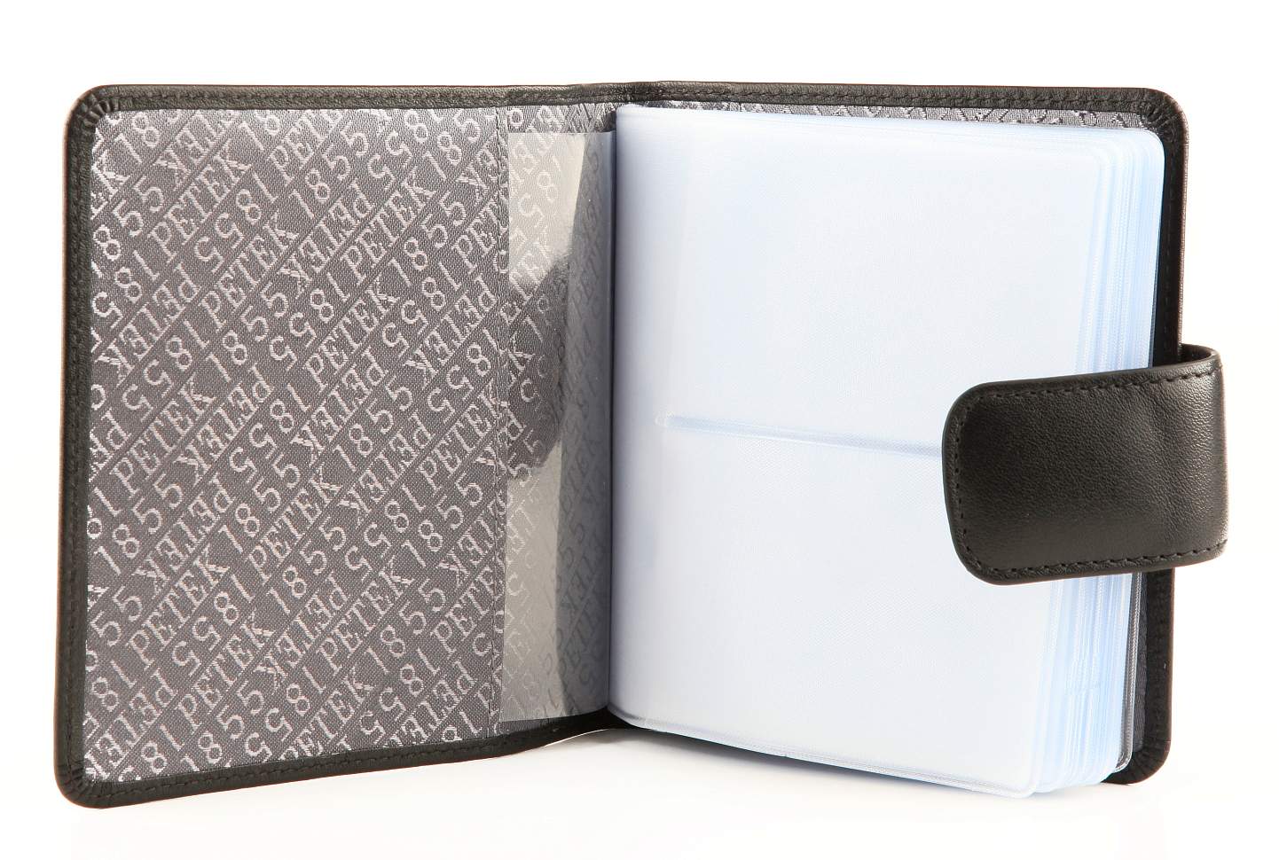 Шикарная визитница из натуральной кожи. Классический дизайн, застегивается на кнопку. Внутри имеются 20 файлов из плотного пластика, по два отделения с каждой стороны. Максимальное количество визитных карточек - 80