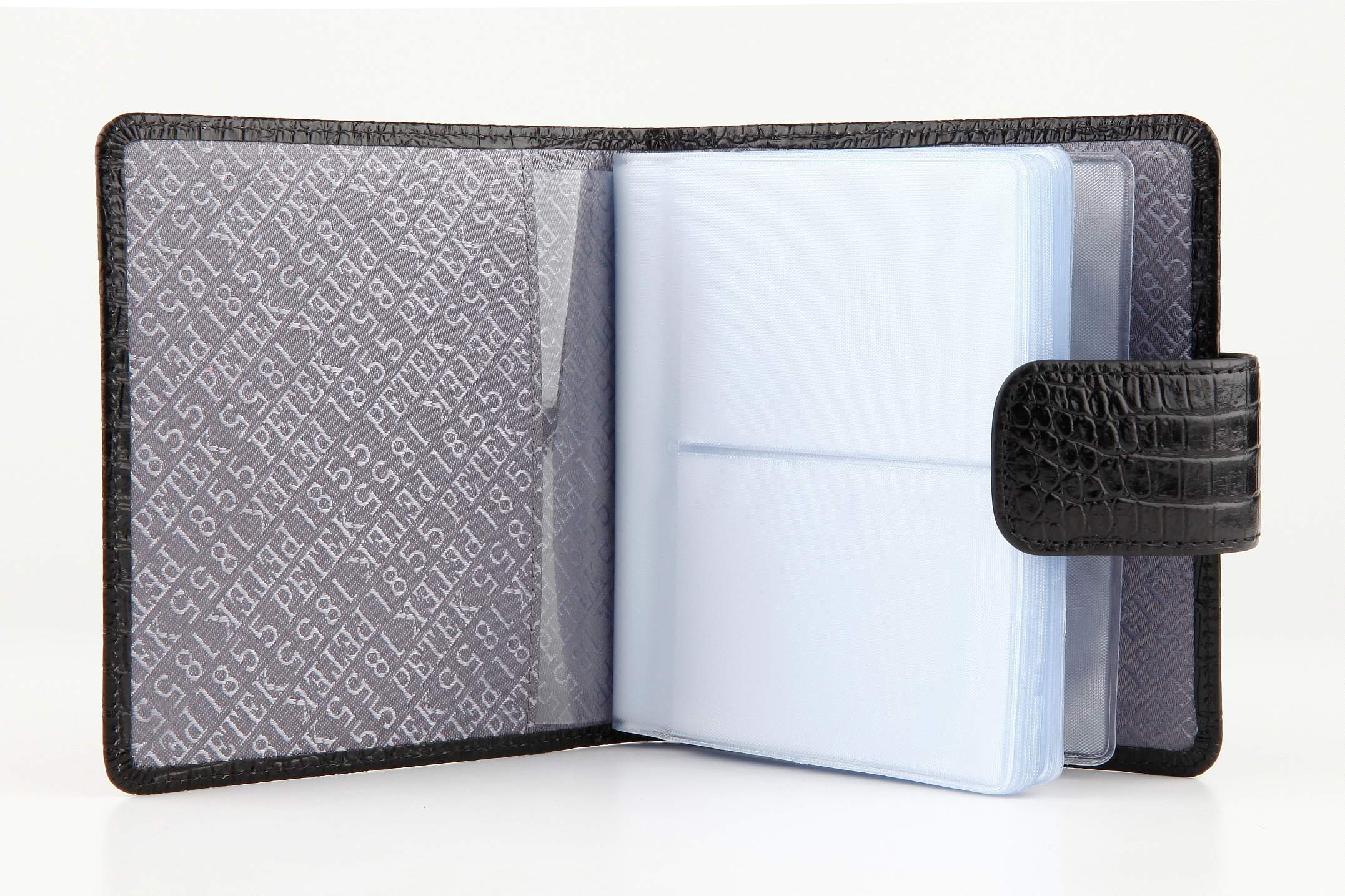 Шикарная визитница из натуральной кожи. Классический дизайн, застегивается на кнопку. Внутри имеются 20 файлов из плотного пластика, по два отделения с каждой стороны. Максимальное количество визитных карточек - 80