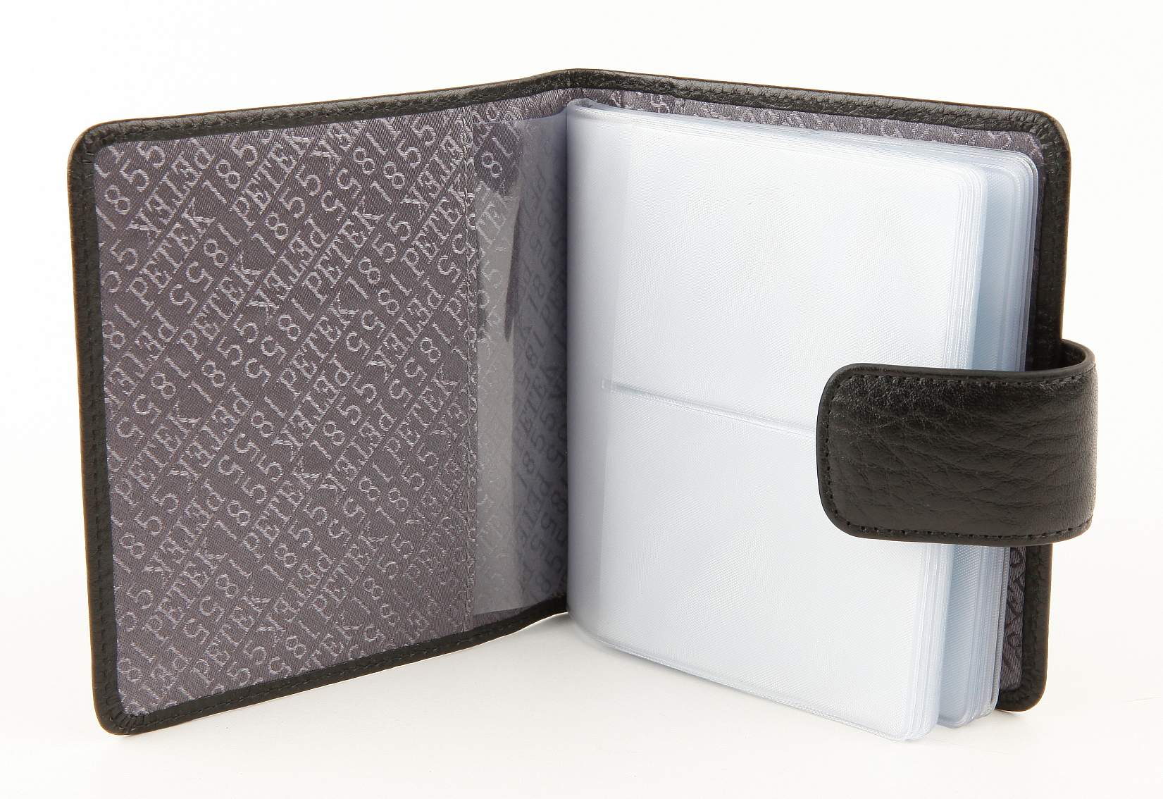 Шикарная визитница из натуральной кожи. Классический дизайн, застегивается на кнопку. Внутри имеются 20 файлов из плотного пластика, по два отделения с каждой стороны. Максимальное количество визитных карточек - 80