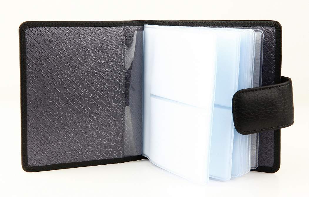 Шикарная визитница из натуральной кожи. Классический дизайн, застегивается на кнопку. Внутри имеются 20 файлов из плотного пластика, по два отделения с каждой стороны. Максимальное количество визитных карточек - 80