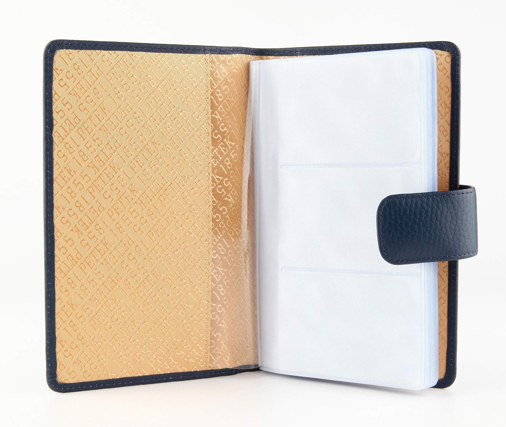 Стильная классическая визитница из натуральной кожи, застегивается на кнопку. Внутри имеются двадцать файлов из прочного пластика. В каждом файле помещается по 3 визитные карточки с одной стороны. Максимальное количество визиток - 120