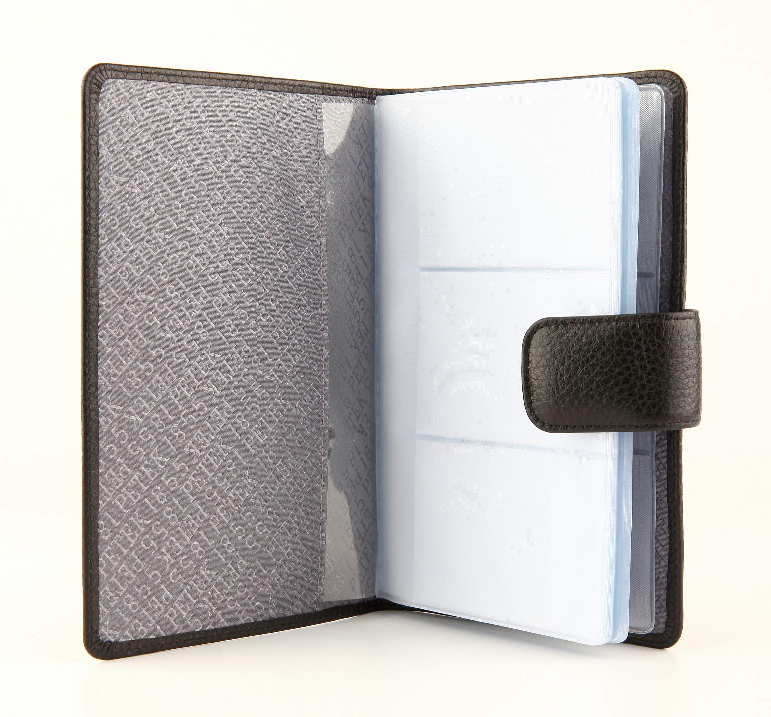 Стильная классическая визитница из натуральной кожи, застегивается на кнопку. Внутри имеются двадцать файлов из прочного пластика. В каждом файле помещается по 3 визитные карточки с одной стороны. Максимальное количество визиток - 120