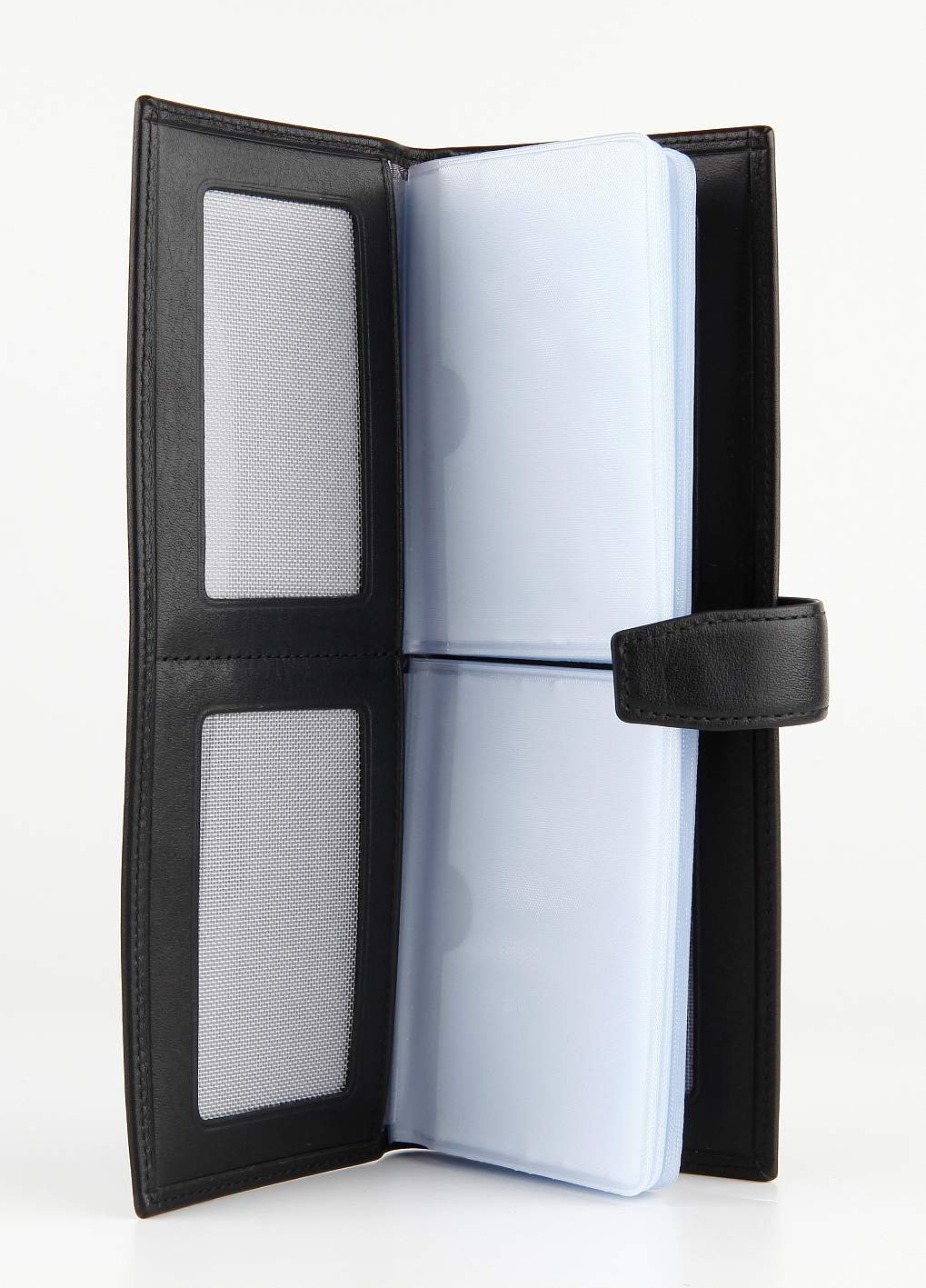 Шикарная визитница из натуральной кожи. Классический дизайн, застегивается на кнопку. Внутри имеются 20 файлов из плотного пластика, по два отделения с каждой стороны. Максимальное количество визитных карточек - 80