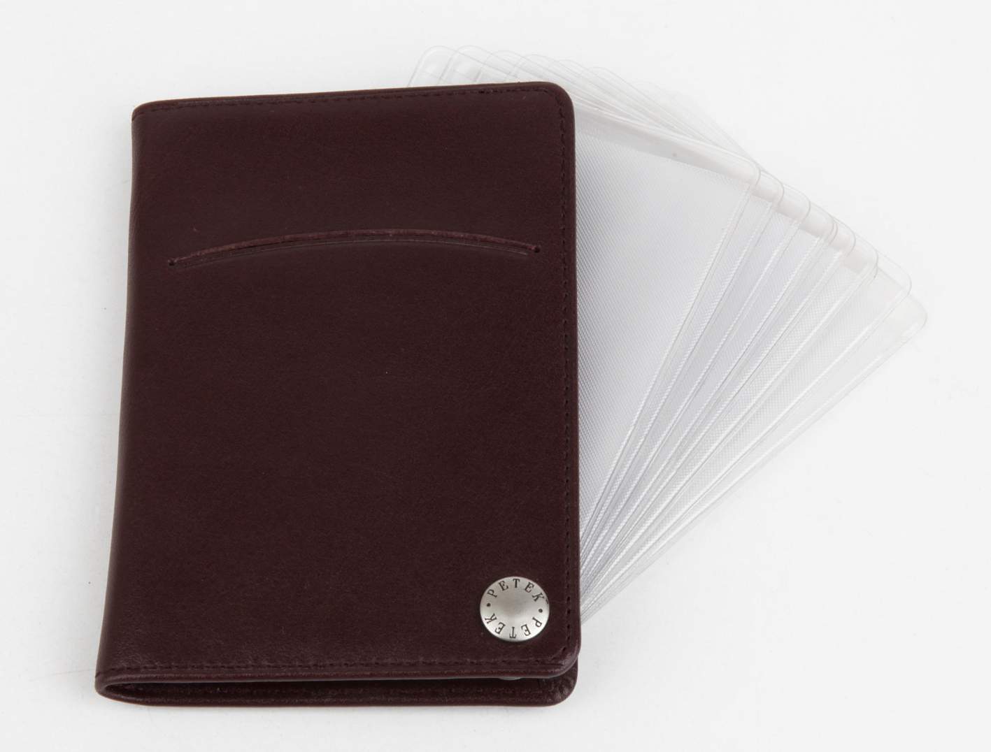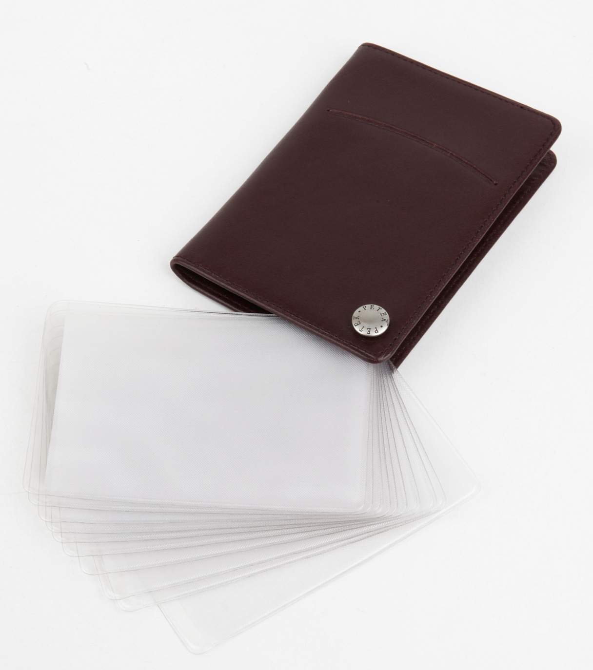 Элегантный, миниатюрный футляр для кредитных и визитных карт из натуральной кожи. Великолепный аксессуар на каждый день, который легко поместится даже в карман. Десять прочных файлов из прозрачного пластика скреплены в углу декоративной кнопкой и раскладываются как веер. Максимальное количество карточек - 20. На внешней поверхности имеется прорезной карман.