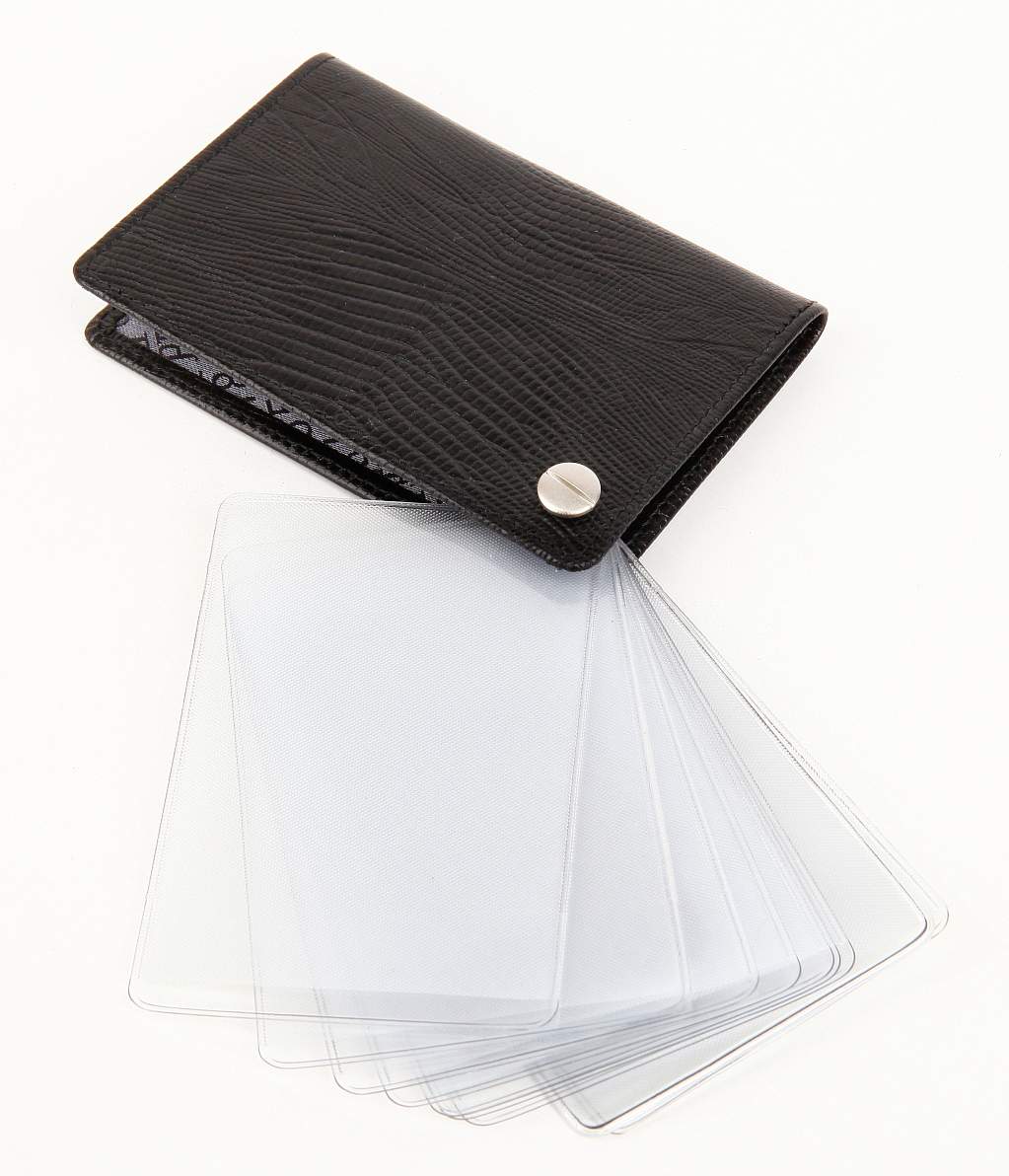 Элегантный, миниатюрный футляр для кредитных и визитных карт из натуральной кожи. Великолепный аксессуар на каждый день, который легко поместится даже в карман. Десять прочных файлов из прозрачного пластика скреплены в углу декоративной кнопкой и раскладываются как веер. Максимальное количество карточек - 20. На внешней поверхности имеется прорезной карман.