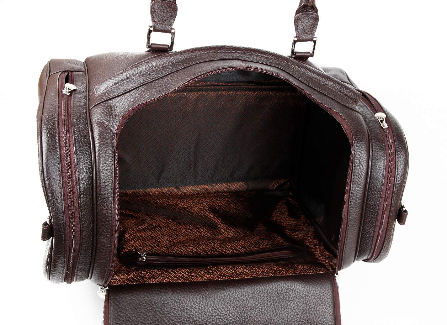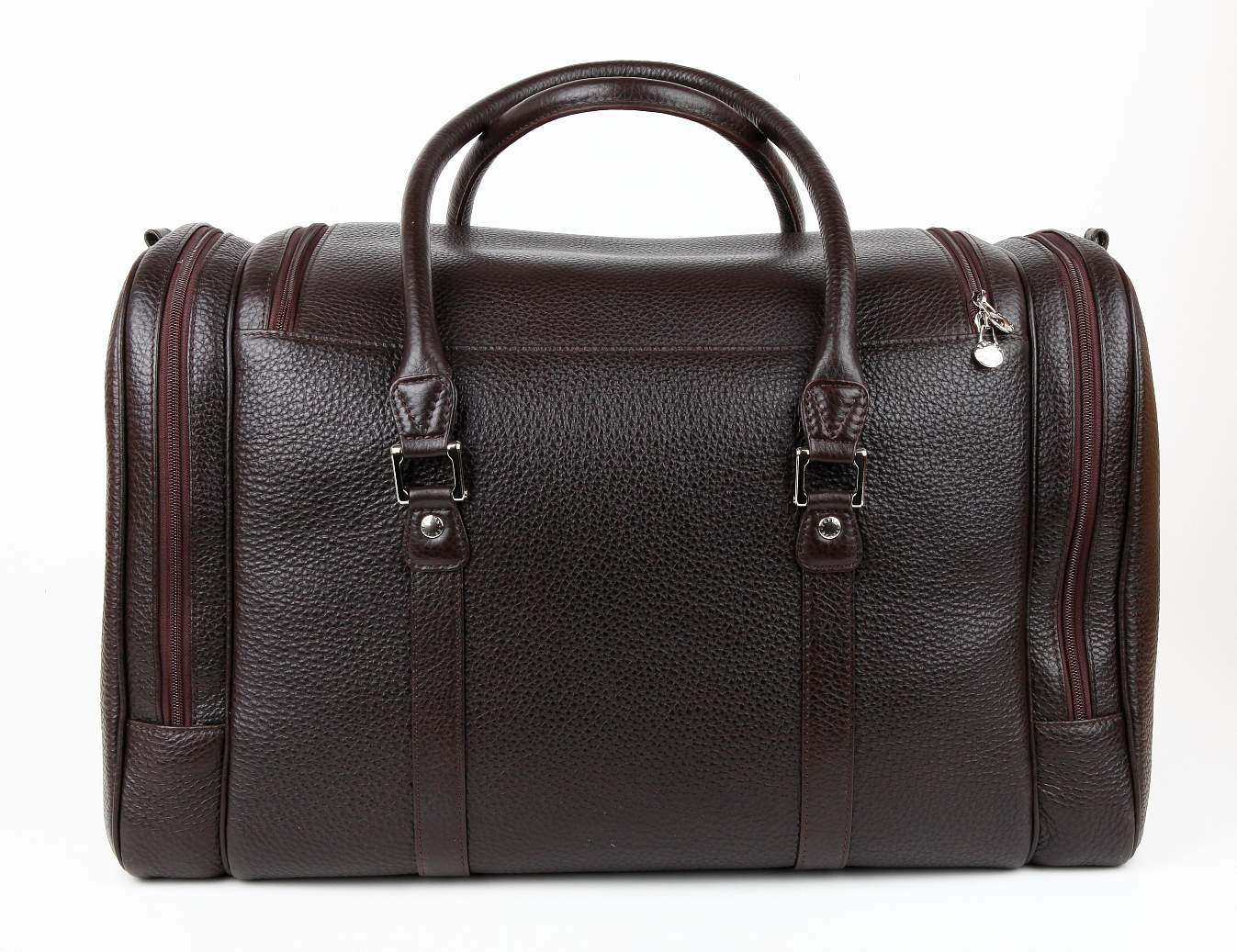 Дорожная кожаная сумка с наплечным ремнём. Вместительная модель без излишеств. Спортивная сумка изготовлена из натуральной телячьей кожи. По бокам расположены два больших кармана которые закрываются на молнию. Основное отделение не имеет разделителей, благодаря чему туда удобно складывать даже крупные вещи. Внутри есть дополнительный боковой карман на молнии, для документов. Для быстрого доступа на лицевой стороне сумки предусмотрен кармашек на молнии, с защитным кожаным козырьком от влаги. На днище сумки расположены три резиновых платформы, они защитят сумку от царапин и луж. В дополнению ко всему, на ручку крепится небольшой кожаный чехол для электронного пропуска или кредитной карточки. Благодаря своему удобству эту сумку можно смело брать с собой в дорогу и в путешествие по свету, или для занятий фитнесом.