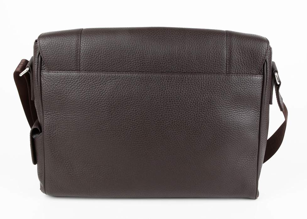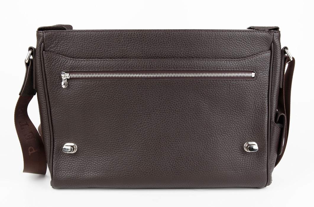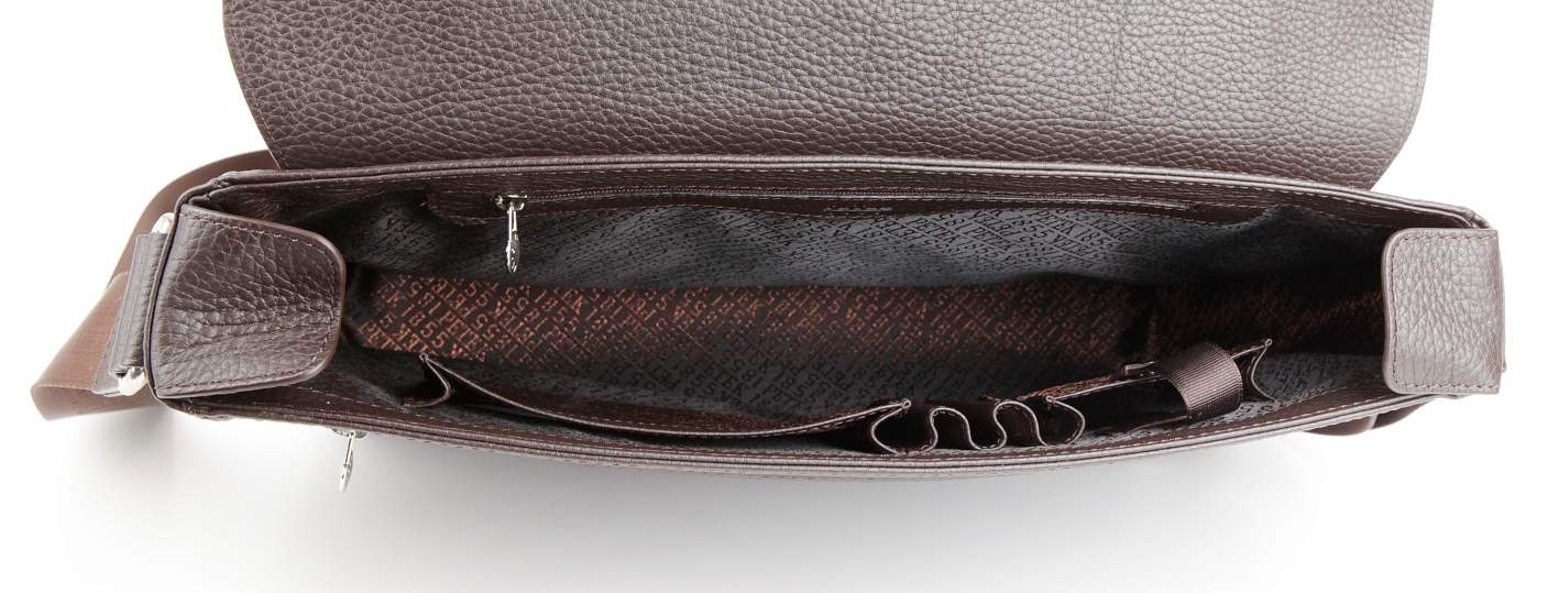 Современная и функциональная сумка-визитка из натуральной фактурной кожи с плечевым ремнем. Это удобная и практичная модель на каждый день. Оригинальный клапан закрывает сумку с помощью двух симпатичных поворотных замочков, на самом клапане имеется небольшой карман на серебристой молнии для самых необходимых мелочей. Внутри одно объемное отделение, в которое легко вмещается ноутбук и небольшой карман на молнии для документов. Специальный карман для мобильного телефона, блок для ручек и записной книжки позволяют разместить все нужные современному деловому человеку аксессуары по своим местам.