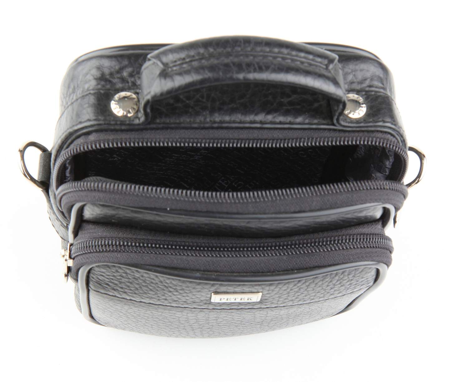 Мужская кожаная сумка Petek. Компактная элегантная модель на любой случай. Состоит из 2 отделений на молии. Сзади есть небольшой карман на молнии. Обладает удобной ручкой и съемным плечевым ремнём, пристегивающимся с помощью надежных карабинов.