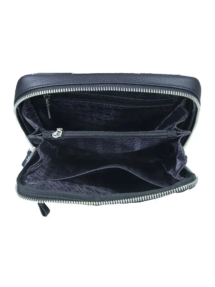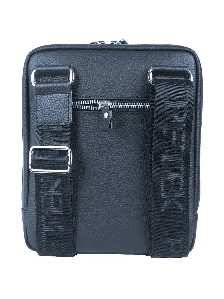 Сумка Petek 1855 изготовлена из натуральной кожи. Она имеет одно большое отделение, разделённое на две секции с помощью перегородки на молнии. Внутри основного отделения находится дополнительное отделение на молнии и открытый карман. Снаружи, на передней и задней панелях, расположены дополнительные отделения на молнии. Сумка закрывается на молнию и оснащена съёмным плечевым ремнём длиной 75 см.
