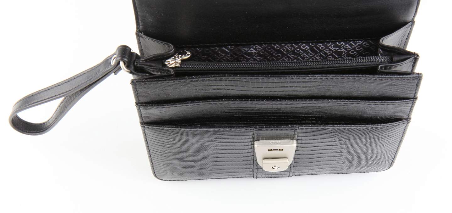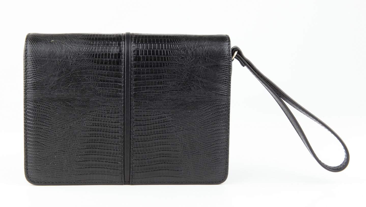Элегантная и стильная сумка-визитка с ремешком на запястье. Модель выполнена из натуральной кожи теленка первоклассной выделки. Основное отделение закрывается на замок с ключом. Вся фурнитура выполнена из стали швейцарской фирмой Amiet из высококачественной стали.